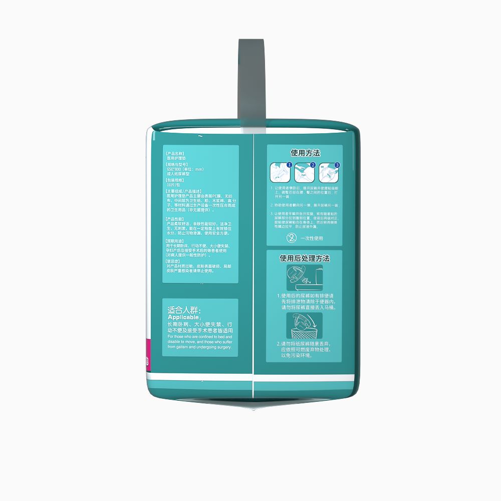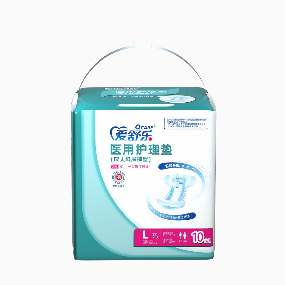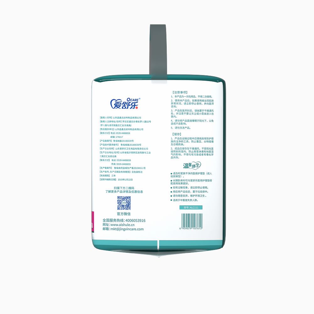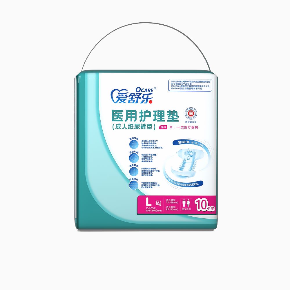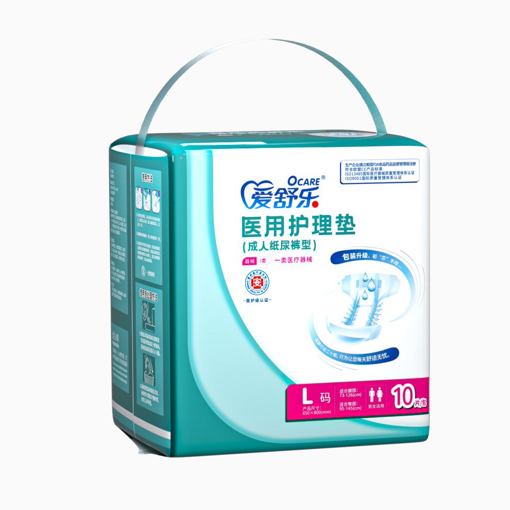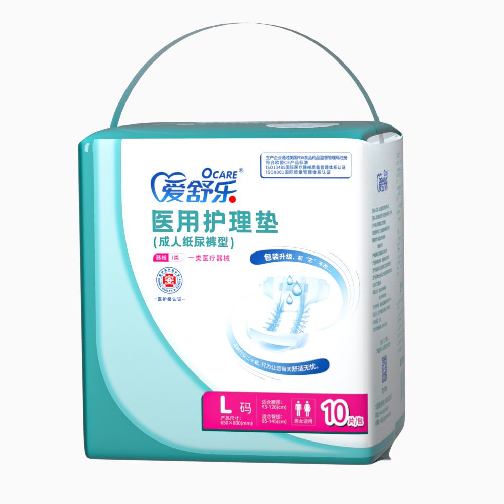 A type of medical device with medical grade quality and more safety care; Unique Aishule deodorization patented process, active protection and deodorization, avoiding odor embarrassment; Biodegradable imported SAP polymer for antibacterial purposes, providing more peace of mind when used; Antibacterial cotton soft surface layer, reducing bacterial growth and the production of bedsores, and maintaining skin health; Free pasting area, making diapers more convenient and comfortable to wear; Product specifications: L size hip circumference 95cm-145cm, XL hip circumference 110-160cm Packaging specification: 10 pieces/12 bags/box