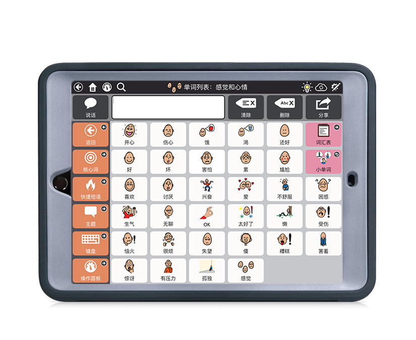 SC Tablet is a compact yet durable iPad-based speech generating device for people of all ages with communication impairments. Pre-loaded with AAC apps, this rugged device has a fitted silicone case to withstand drops, complete with reinforced corners, a screen-protecting frame, and built-in handle and stand. It’s available in two sizes: SC Tablet and SC Tablet Mini.