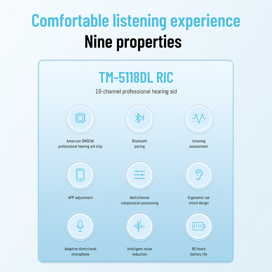 This hearing aid is a digital 16 channel, EQ32 channel RIC style, suitable for people with moderate to severe hearing loss.