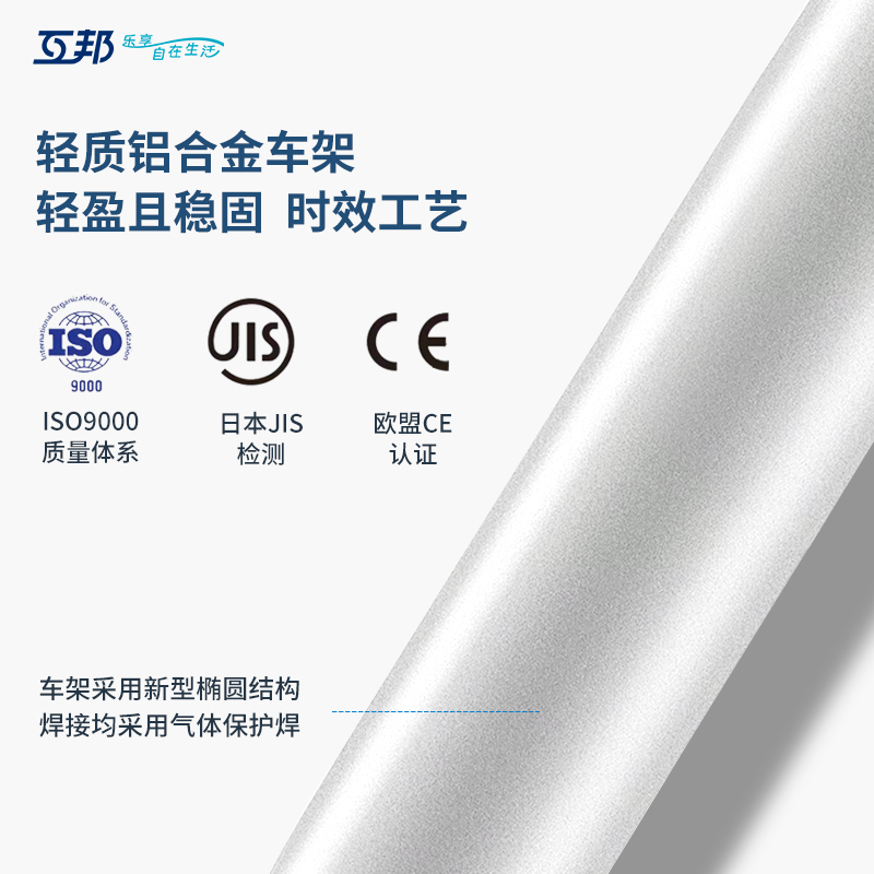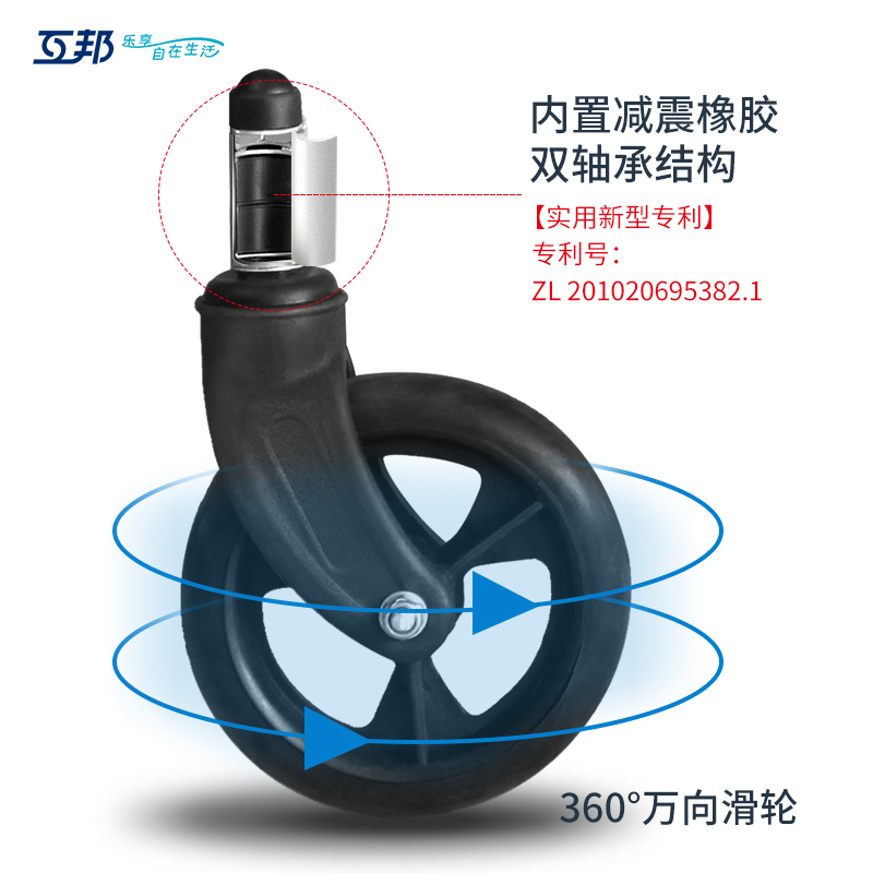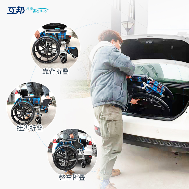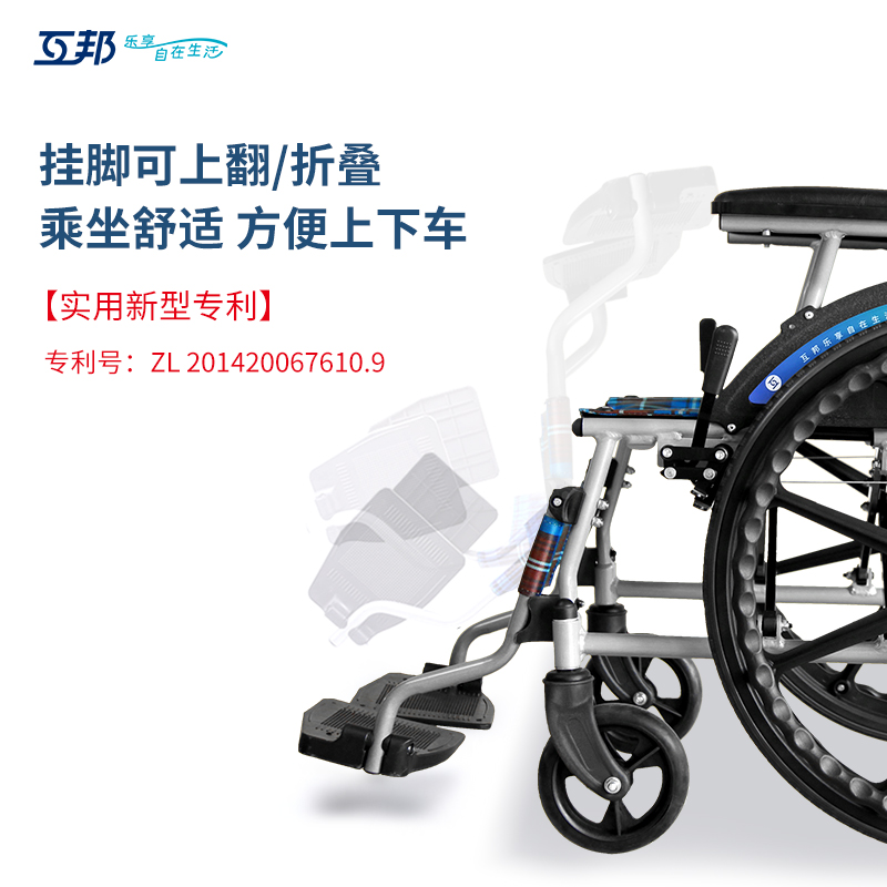 Hubang manual wheelchair L33, the frame is made of aluminum alloy, the whole vehicle weighs only 11KG, can be carried with one hand, has movable legs, is foldable and compact, does not take up space, and can be stored in narrow spaces.