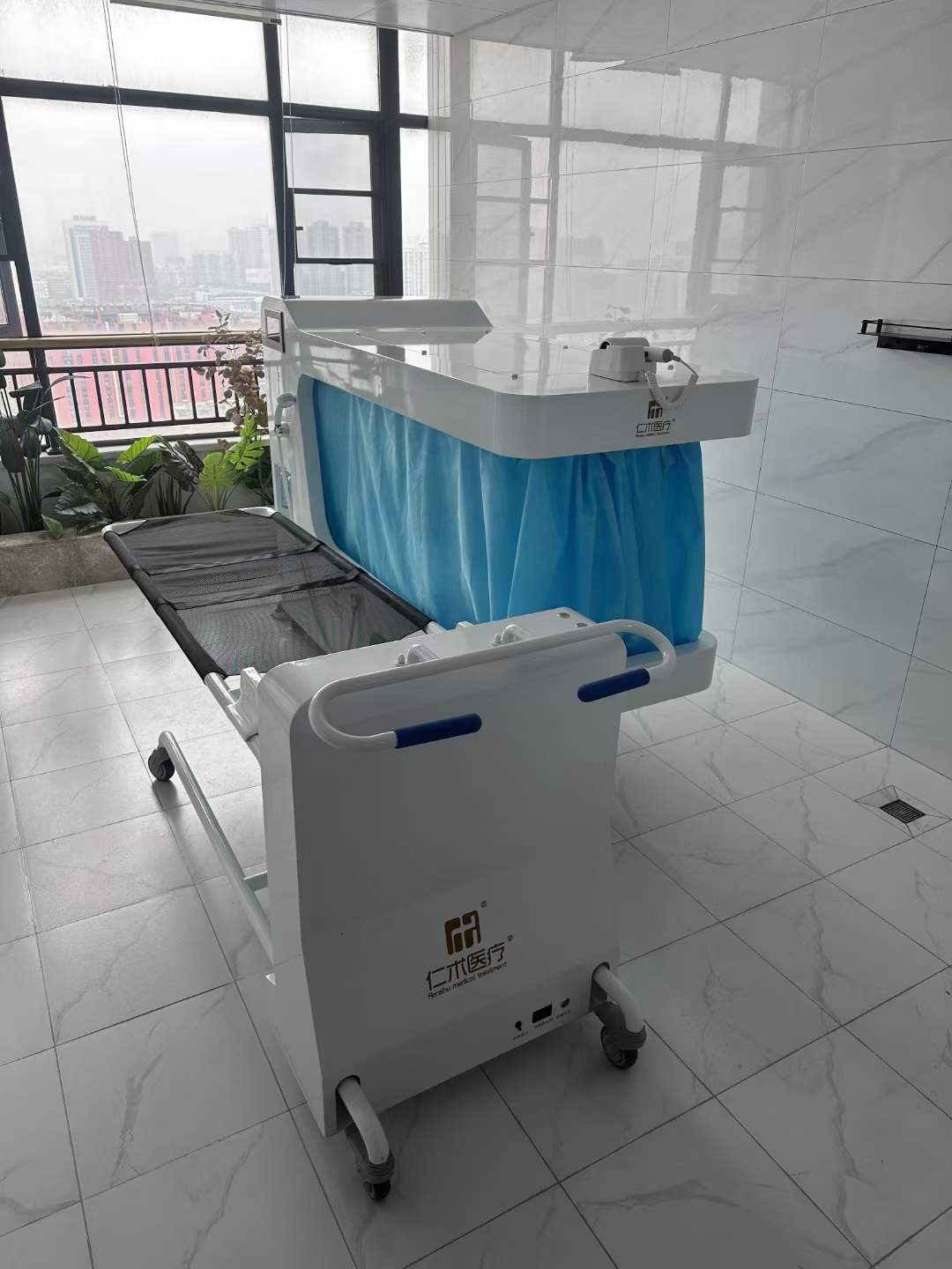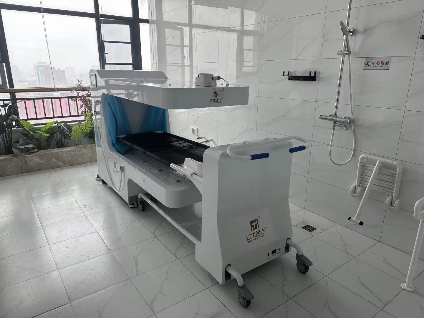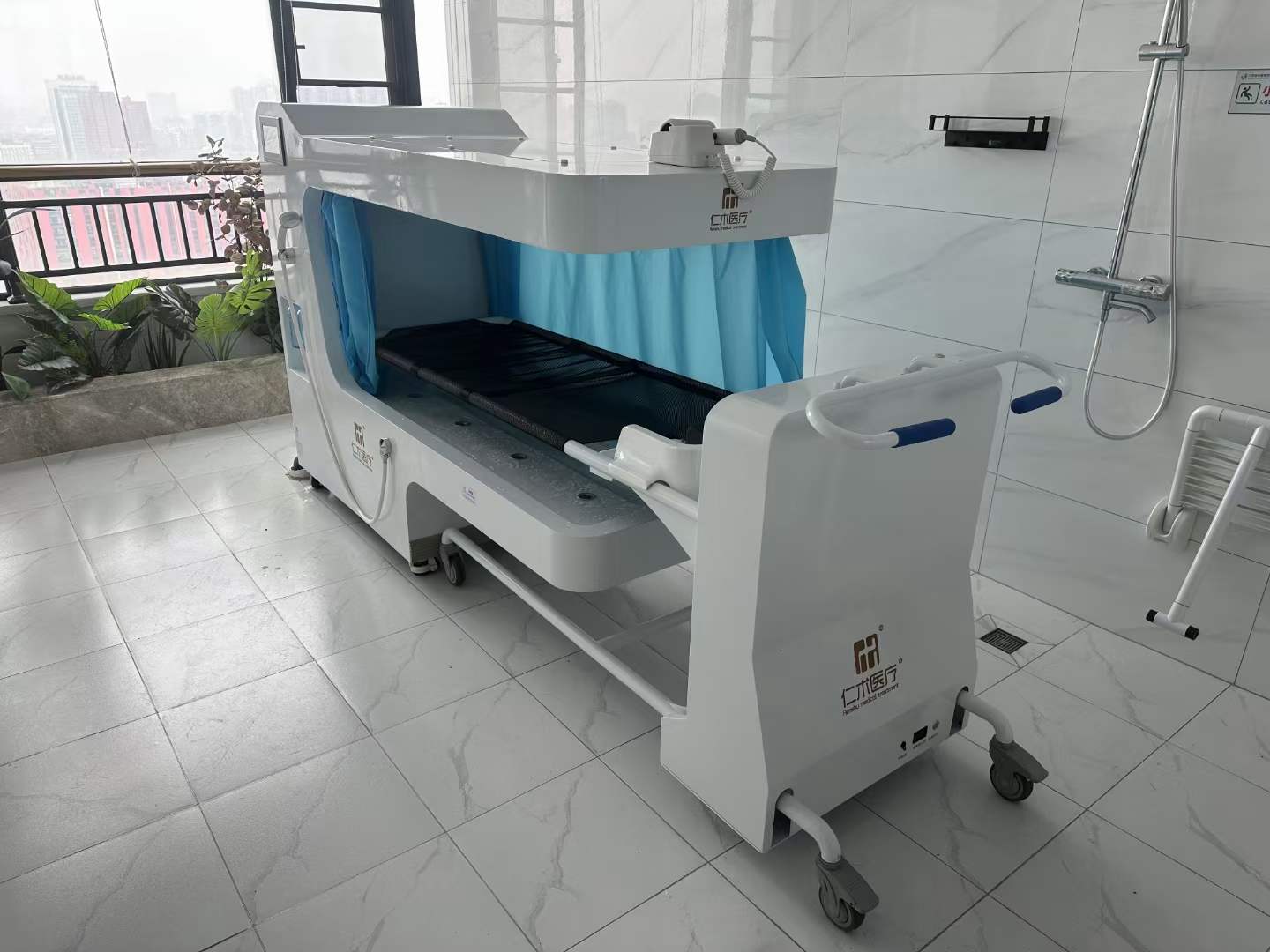 The barrier-free bathing machine is specifically designed for individuals with mobility challenges, featuring a stainless steel frame and non-irritating EVA material to ensure comfort and safety. With one-touch activation of constant-temperature full-body cleansing, multiple nozzles work in tandem with 250μm micro-particle hydrotherapy, complemented by music therapy for emotional relaxation. The stainless steel body facilitates easy maintenance; the automatic lifting trolley, water-electric separation system, and dual leakage protection ensure effortless transfer. Post-wash warm air drying and head drying complete the care routine, enhanced by ozone and UV dual disinfection with self-cleaning pipes. Certified CE and listed in China's National Rehabilitation Assistive Devices Catalog, this solution provides convenient, safe, and comfortable bathing experiences for hospitals, nursing facilities, and home rehabilitation environments.