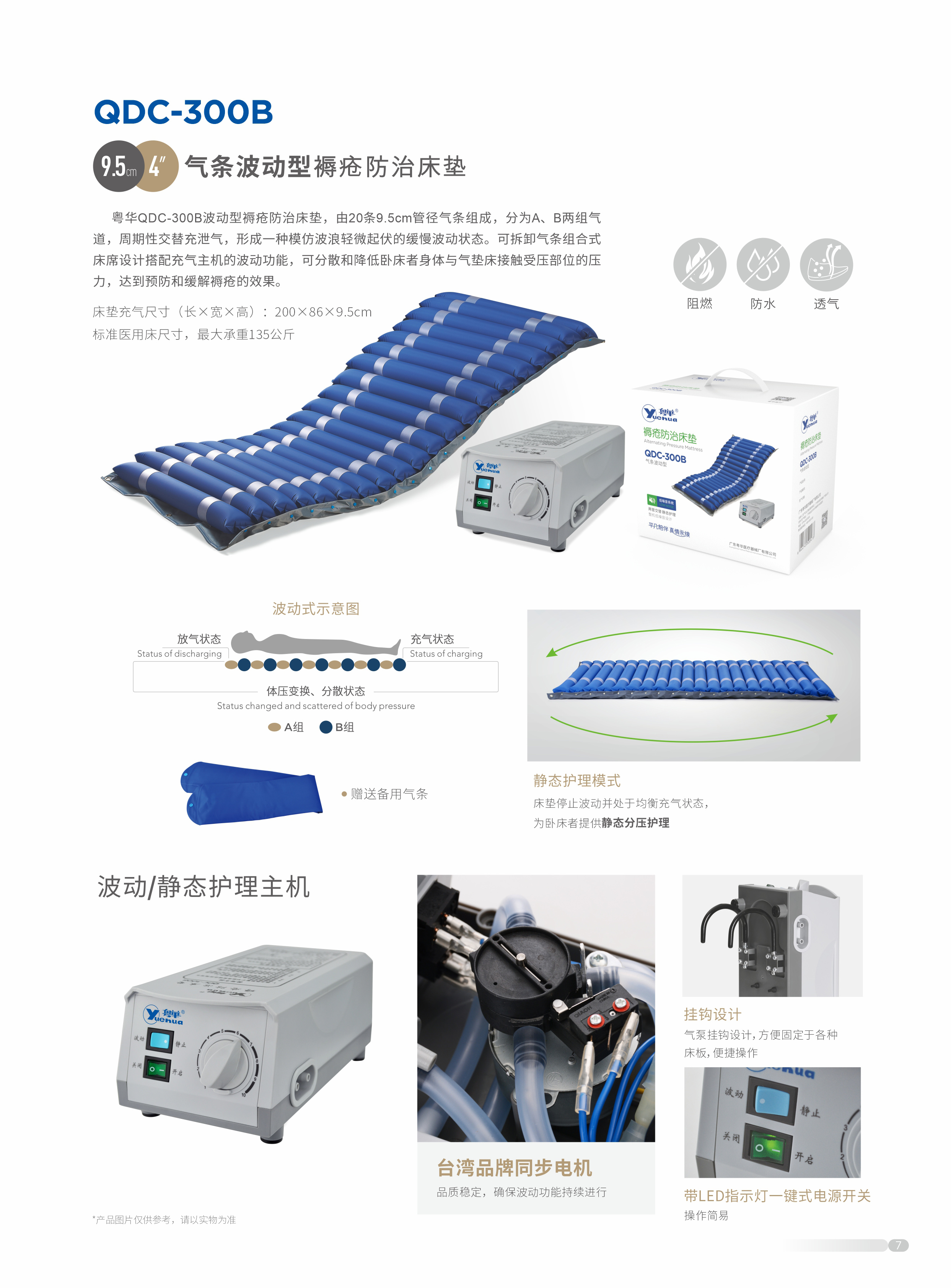 The 20 9.5cm-high cells in Nylon+PVC are particularly comfortable.They are fixed by means of press-studs.Very easy to install, useand maintain with the possibility of adjusting the pressure according to the patient's weight.They are also easily interchangeable in case of breakage.The pump can be hung tothe end of the bed by means of two hooks.
