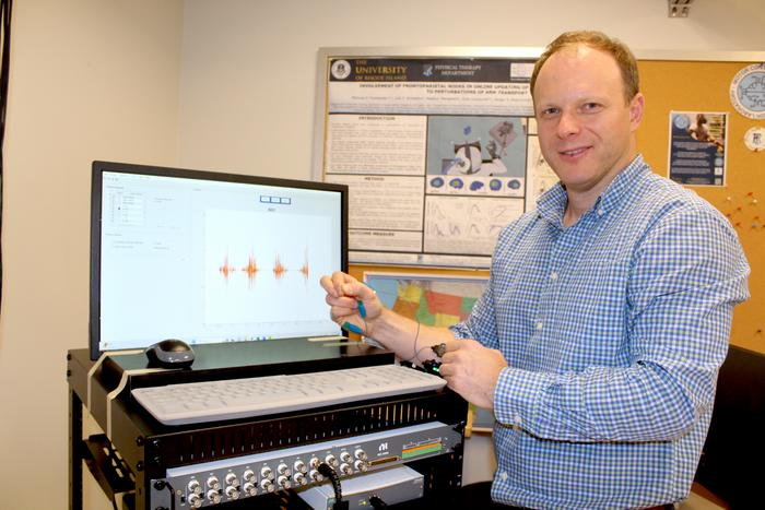 URI Physical Therapy Professor Mariusz Furmanek, working with engineering professors Reza Abiri and Yalda Shahriari, demonstrates the cutting-edge closed-loop feedback system to monitor the muscle and brain activity used to help post-stroke patients.