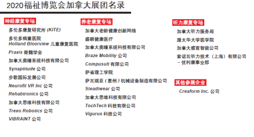 加拿大展團(tuán)的26家展商中包括了加拿大知名的康復(fù)研發(fā)和臨床服務(wù)機構(gòu):多倫多康復(fù)研究所、多倫多病童醫(yī)院、Holland BloorView兒童康復(fù)醫(yī)院、加拿大老齡創(chuàng)新網(wǎng)、Praxis脊髓學(xué)會、加拿大聽力服務(wù)局、及渥太華大學(xué)醫(yī)學(xué)院。以及19家有著先進(jìn)康復(fù)解決方案的創(chuàng)新企業(yè)及其產(chǎn)品, 產(chǎn)品廣泛涵蓋上肢康復(fù)、帕金森凍僵步態(tài)康復(fù)、養(yǎng)老護(hù)理、腦健康評估等。 詳情請查看資料架的展團(tuán)手冊和各展商的在線展臺。