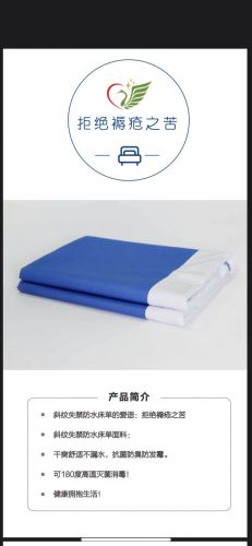 斜紋失禁抗菌防螨床單,日本百年企業(yè)榮譽(yù)制造。產(chǎn)品正面采用35%棉和65%滌,背面采用高溫覆膜用獨(dú)特工藝制作而成,具有干爽、透氣、抗菌、易干的特性。不漏水不漏尿,能有效防止?jié)駳?、尿堿侵蝕皮膚,有效防止褥瘡的產(chǎn)生,并對褥瘡及其他外傷有促進(jìn)愈合的功效。