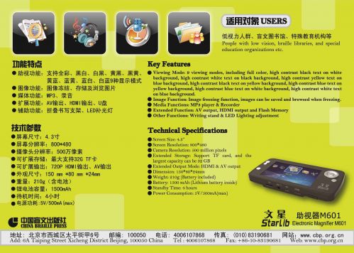 1.4.3英寸TFT高清液晶屏,實時圖像顯示 500萬像素攝像頭,自帶補光燈,四種可選場景; 2.支持圖像放大、定格、存儲、九種色彩模式; 3.圖像定格、拍照、圖片回放功能; 4.錄音、音頻播放功能; 5.支持外接顯示器,支持HDMI、NTSC或PAL格式