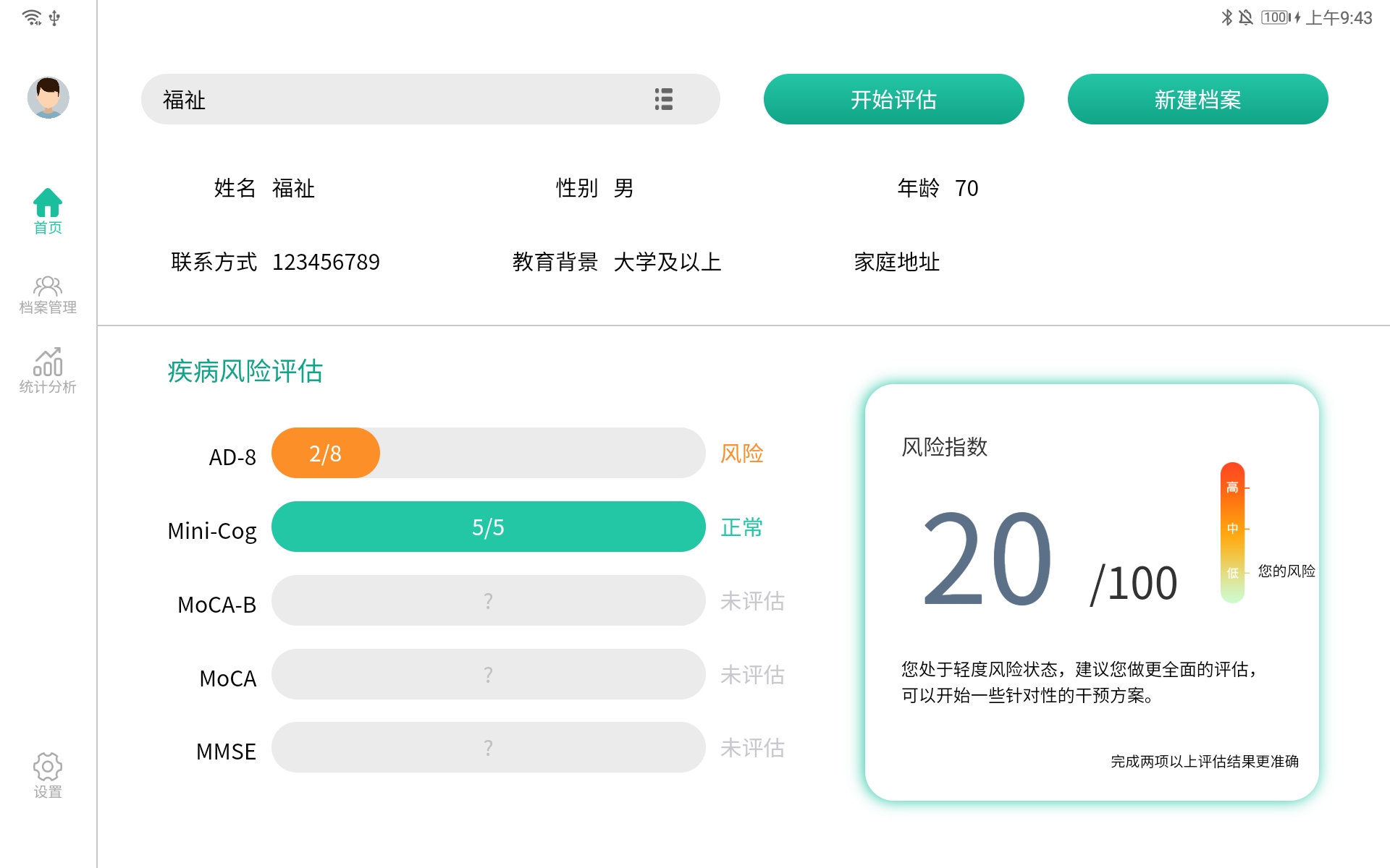 智能認(rèn)知評估與管理系統(tǒng)依托移動互聯(lián)網(wǎng),采用臨床神經(jīng)醫(yī)學(xué)、認(rèn)知科學(xué)、數(shù)據(jù)分析科學(xué)和康復(fù)醫(yī)學(xué)相結(jié)合的方式,研究早期老年癡呆癥的精準(zhǔn)評估技術(shù)和個性化康復(fù)干預(yù)方案。軟硬件結(jié)合開發(fā)出一套電子化、智能化的老年癡呆癥評估和干預(yù)服務(wù)應(yīng)用,能夠在醫(yī)院和醫(yī)院之前的家庭和社區(qū)完成早期老年癡呆癥篩查評估,從而更早期介入干預(yù),預(yù)防和延緩老年癡呆癥的發(fā)展。