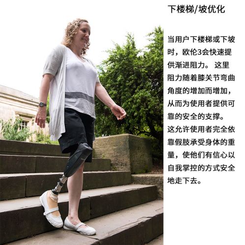 歐倫3代全智能膝關(guān)節(jié)采用了動作智能系統(tǒng),新增單車模式、站立鎖定省力功能,更安全的和最佳的漸進(jìn)步速控制特點,它的新一代傳感器實時感應(yīng)膝關(guān)節(jié)的動作情況,并快速對數(shù)據(jù)進(jìn)行處理和反饋。由于歐倫三代會依據(jù)關(guān)節(jié)屈曲的角度的增加而增加支撐阻力,因此支撐穩(wěn)定性能與安全性能得以大大提高,是其他智能關(guān)節(jié)所不具備的。在行走時,它的微處理器會控制氣壓輸出部分,對擺動期中的不同步速提供良好的控制,無論快速還是漫步;