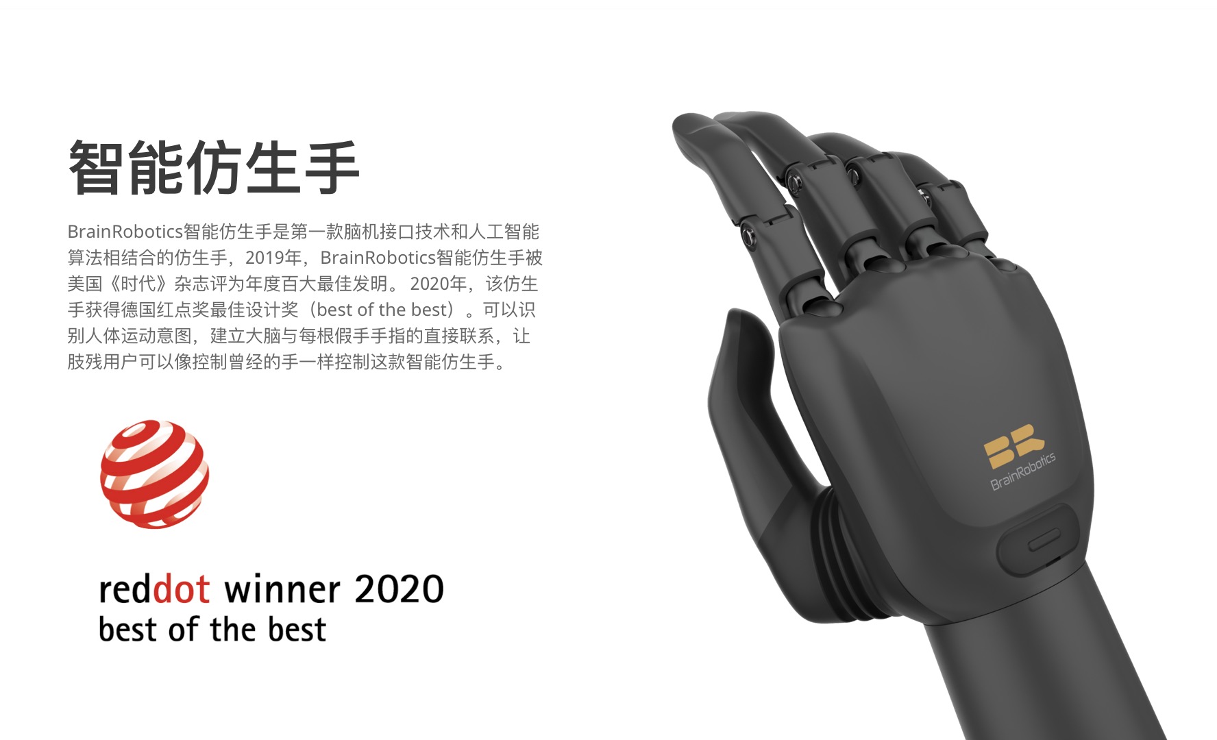 這是第一款腦機(jī)接口技術(shù)和人工智能算法相結(jié)合的仿生手,2019年,BrainRobotics智能仿生手被美國(guó)《時(shí)代》雜志評(píng)為年度百大最佳發(fā)明。 2020年,該仿生手獲得德國(guó)紅點(diǎn)獎(jiǎng)最佳設(shè)計(jì)獎(jiǎng)(best of the best)??梢宰R(shí)別人體運(yùn)動(dòng)意圖,建立大腦與每根假手手指的直接聯(lián)系,讓肢殘用戶(hù)可以像控制曾經(jīng)的手一樣控制這款智能仿生手。