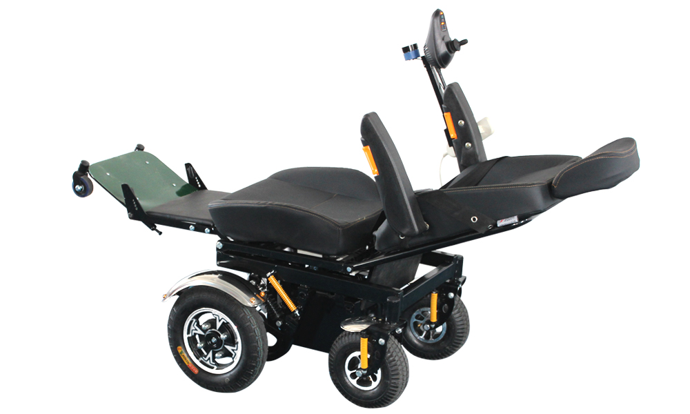 兩側(cè)扶手可抬起,可 360 度 0 半徑原地轉(zhuǎn)彎。具有電動(dòng)站立,電動(dòng)平躺, 電動(dòng)后仰,電動(dòng)抬腿功能,可電動(dòng)站立行走。前輪驅(qū)動(dòng),越障能力更好