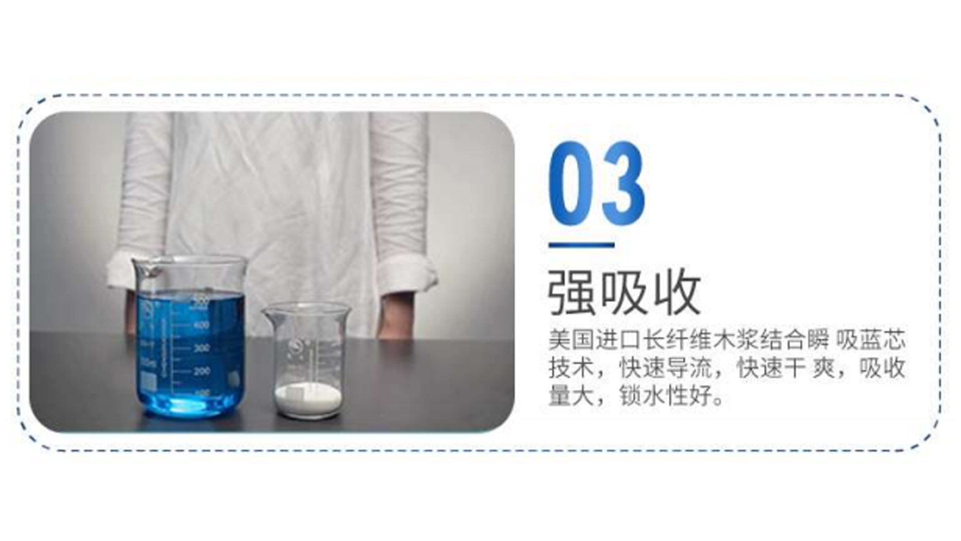 加長設(shè)計 產(chǎn)品加長設(shè)計,增加液體的吸收面積 有效預(yù)防側(cè)漏 高分子吸收樹脂結(jié)合進(jìn)口長纖維木漿 雙重吸收體,超量吸收 更吸收,更鎖水 菱形導(dǎo)流 導(dǎo)流網(wǎng)道,能迅速擴(kuò)散并吸收液體 保持皮膚干爽