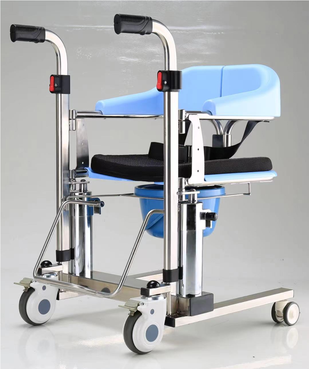 1. 整車采用優(yōu)質異型不銹鋼焊接,壁厚≥2.0mm,表面烤漆處理,無刮痕,無毛刺,無棱角,活動式扶手,帶座便功能,整車高低雙液壓調節(jié)。 2. 座位高度可腳踏來回踩踏可高低調節(jié),調節(jié)平穩(wěn)性能好。調節(jié)范圍0-20CM。 3. 座板可手動張合。方便殘疾人轉移。 4.靠背采用一次成型PE墊,坐墊采用一次成型ABS墊,易清洗; 5.配置帶剎車防撞輪,轉動靈活安全;前輪5寸靜音輪,后輪3寸。