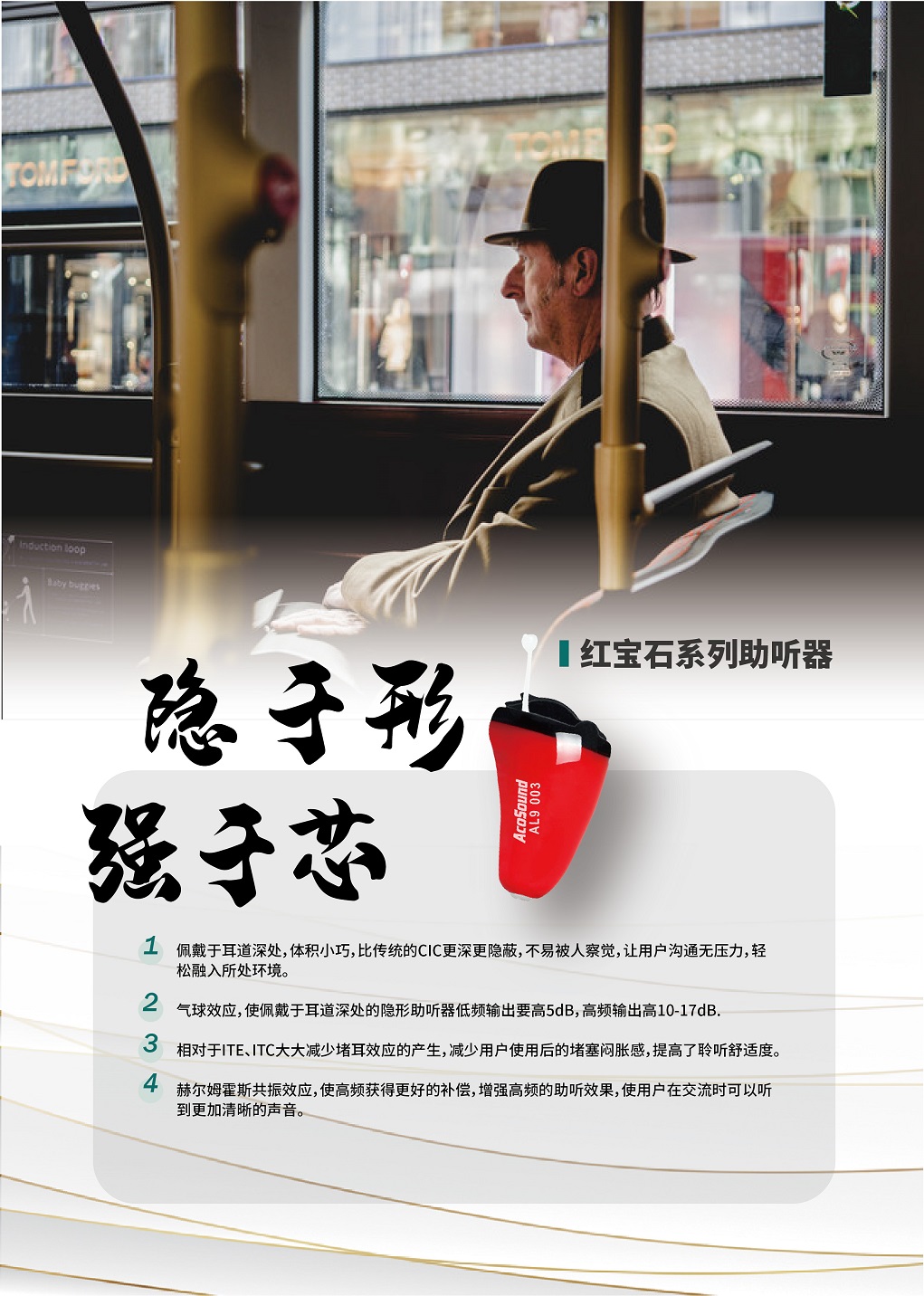 佩戴于耳道深處,體積小巧,比傳統的CIC更深更隱蔽,不易被人察覺,讓用戶溝通無壓力,輕松融入所處環(huán)境。 氣球效應,使佩戴于耳道深處的隱形助聽器低頻輸出要高5dB,高頻輸出要高10-17dB。 相對于ITE、ITC大大減少堵耳效應的產生,減少用戶使用后的堵塞悶脹感,提高了聆聽舒適度。 外殼采用不透明納米陶瓷材料,更堅固更具韌性,不易損壞。