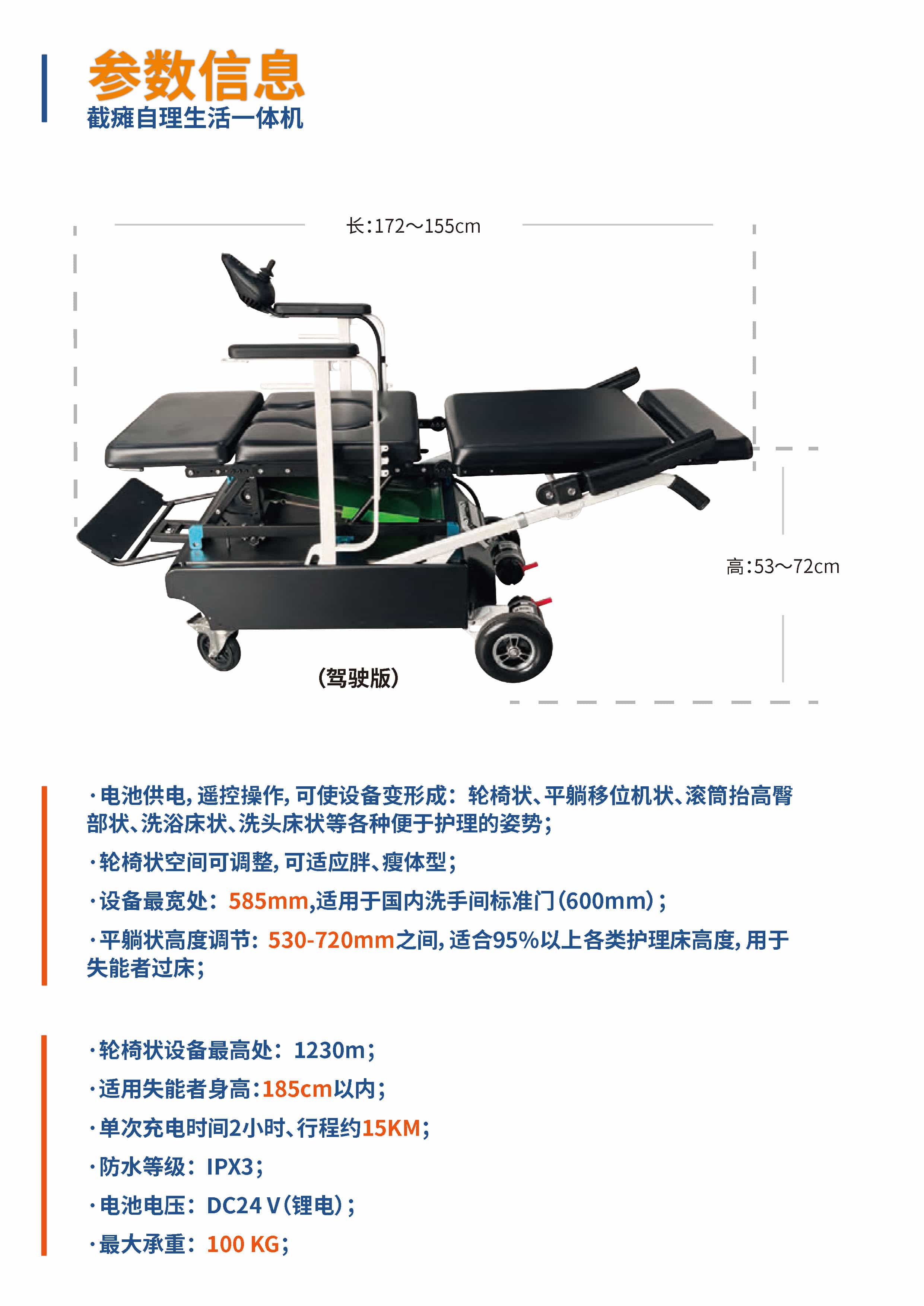 產(chǎn)品特點(diǎn): 1)解決截癱患者床、椅相互轉(zhuǎn)移痛點(diǎn),實(shí)現(xiàn)截癱患者轉(zhuǎn)移生活無(wú)障礙活動(dòng)閉環(huán); 2)解決截癱患者自己處理二便、進(jìn)浴室洗浴的基本生活問(wèn)題; 3)提高截癱患者自理能力; 4)提高截癱患者就業(yè)率; 5)提高截癱患者個(gè)人尊嚴(yán)、個(gè)人隱私。 應(yīng)用場(chǎng)景: 1.截癱患者在床上通過(guò)遙控對(duì)主機(jī)變形,使得主機(jī)與床等高并靠攏床邊、降下前扶手和靠背; 3、一部分截癱患者可以通過(guò)自身努力翻滾或上肢撐移的方式,實(shí)現(xiàn)由床轉(zhuǎn)