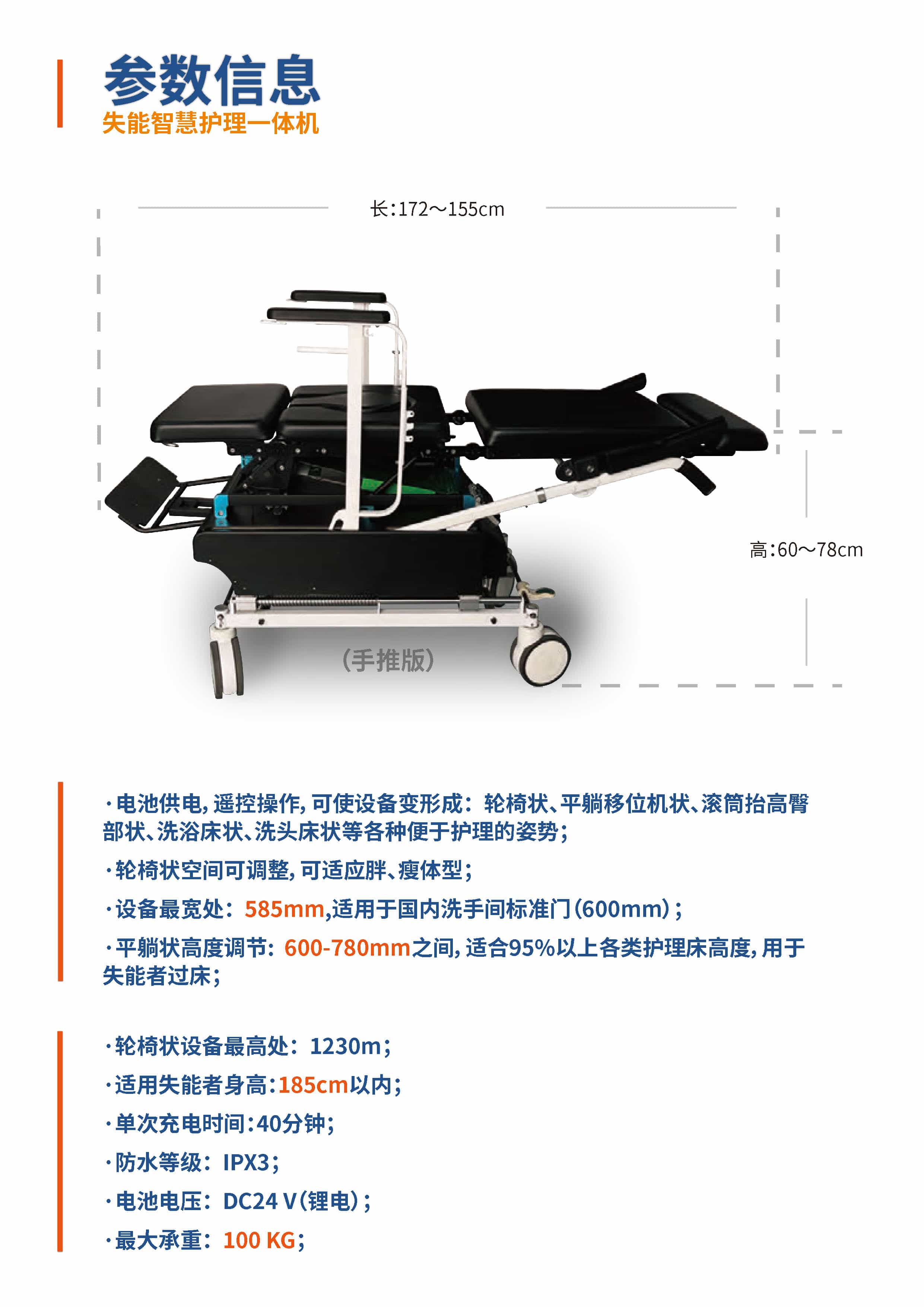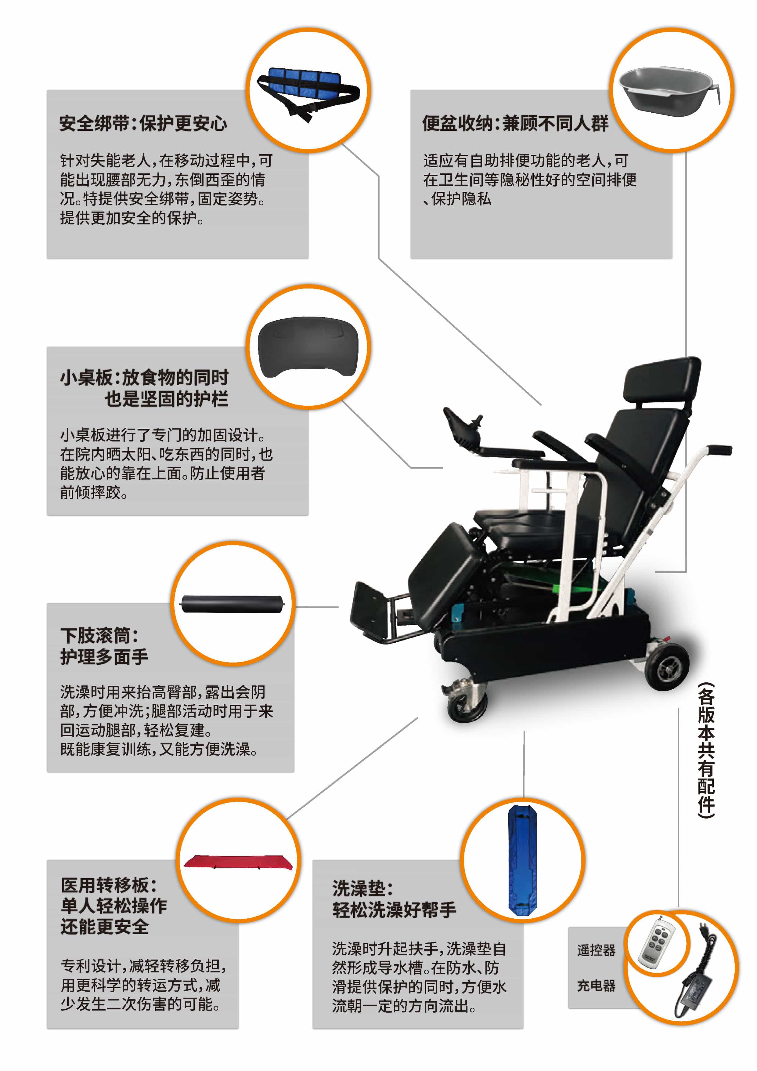 產(chǎn)品特點(diǎn): 1)解決失能人士床、椅相互轉(zhuǎn)移痛點(diǎn),實(shí)現(xiàn)失能人士轉(zhuǎn)移生活無(wú)障礙活動(dòng)閉環(huán); 2)解決失能人士二便無(wú)接觸護(hù)理;、進(jìn)浴室洗浴的基本生活問(wèn)題; 3)解決失能人士進(jìn)浴室洗浴、洗頭等衛(wèi)生問(wèn)題; 4)解決失能人士長(zhǎng)期臥床生活問(wèn)題,使失能人士出門曬太陽(yáng)、 鄰里互動(dòng)方便問(wèn)題; 5)保障失能人士個(gè)人尊嚴(yán)、個(gè)人隱私問(wèn)題 6)解決失能人士護(hù)理環(huán)境惡劣問(wèn)題; 7)解決失能人士腿褲子坐便難問(wèn)題 應(yīng)用場(chǎng)景: