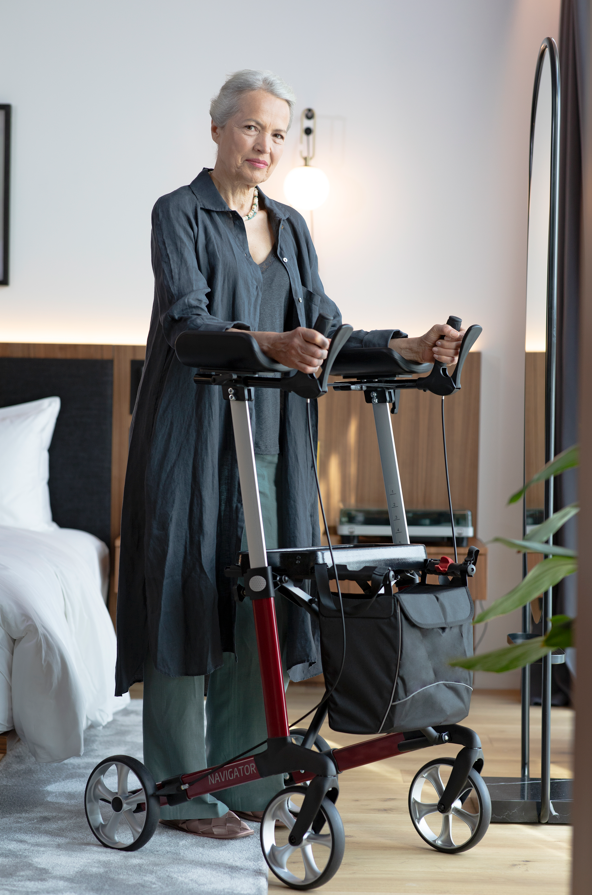 瑞云-航海家是為患有關(guān)節(jié)炎或手部功能受限的用戶開發(fā)的助行器,兼具功能性與舒適性。 前臂支撐架主要由大尺寸的海綿墊和手剎組成,用戶通過手臂的力量推動助行器前行,有固定式和旋轉(zhuǎn)式兩種類型可旋轉(zhuǎn)的支撐架有三個調(diào)節(jié)角度,滿足不同用戶的需求。