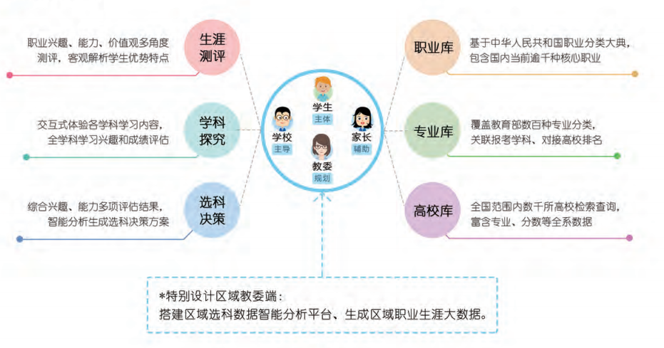 核心功能: 通過霍蘭德興趣測(cè)評(píng)量表、多元智能測(cè)評(píng)量表、MBTI職業(yè)性格測(cè)評(píng)量表、WVI職業(yè)價(jià)值觀測(cè)試量表進(jìn)行興趣、能力、性格和價(jià)值觀的綜合分析,科學(xué)測(cè)評(píng)系統(tǒng)和完善的報(bào)告,智能推薦適合學(xué)科及專業(yè)職業(yè) 從選科決策、專業(yè)定位、職業(yè)方向到生涯規(guī)劃,形成完整的學(xué)業(yè)與生涯規(guī)劃路徑。從離學(xué)生最近的學(xué)科選擇開始生涯之路的規(guī)劃,與學(xué)生的生活更接軌。大數(shù)據(jù)報(bào)告,幫助老師快速掌握全校學(xué)生的選擇意象。豐富的資源庫內(nèi)容