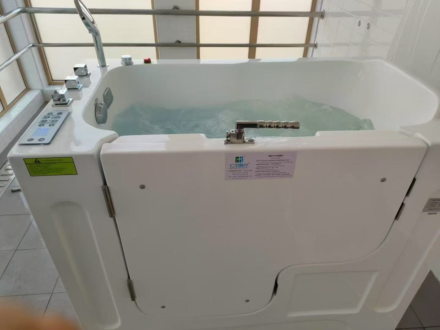 RH-905坐式藥浴浴槽,亞克力+鋁合金,1300×750×1150mm,零刺激零甲醛。460L恒溫藥浴,可加藥包/香薰,冷熱混水,6渦流5氣泡,溫度變色LED,藍(lán)牙音樂(lè),臭氧<0.01mg/m³,手動(dòng)+腳踏雙排水。外開(kāi)門(mén)+低入口+304門(mén)鎖,進(jìn)出安全,適合老年、術(shù)后及康養(yǎng)機(jī)構(gòu)。