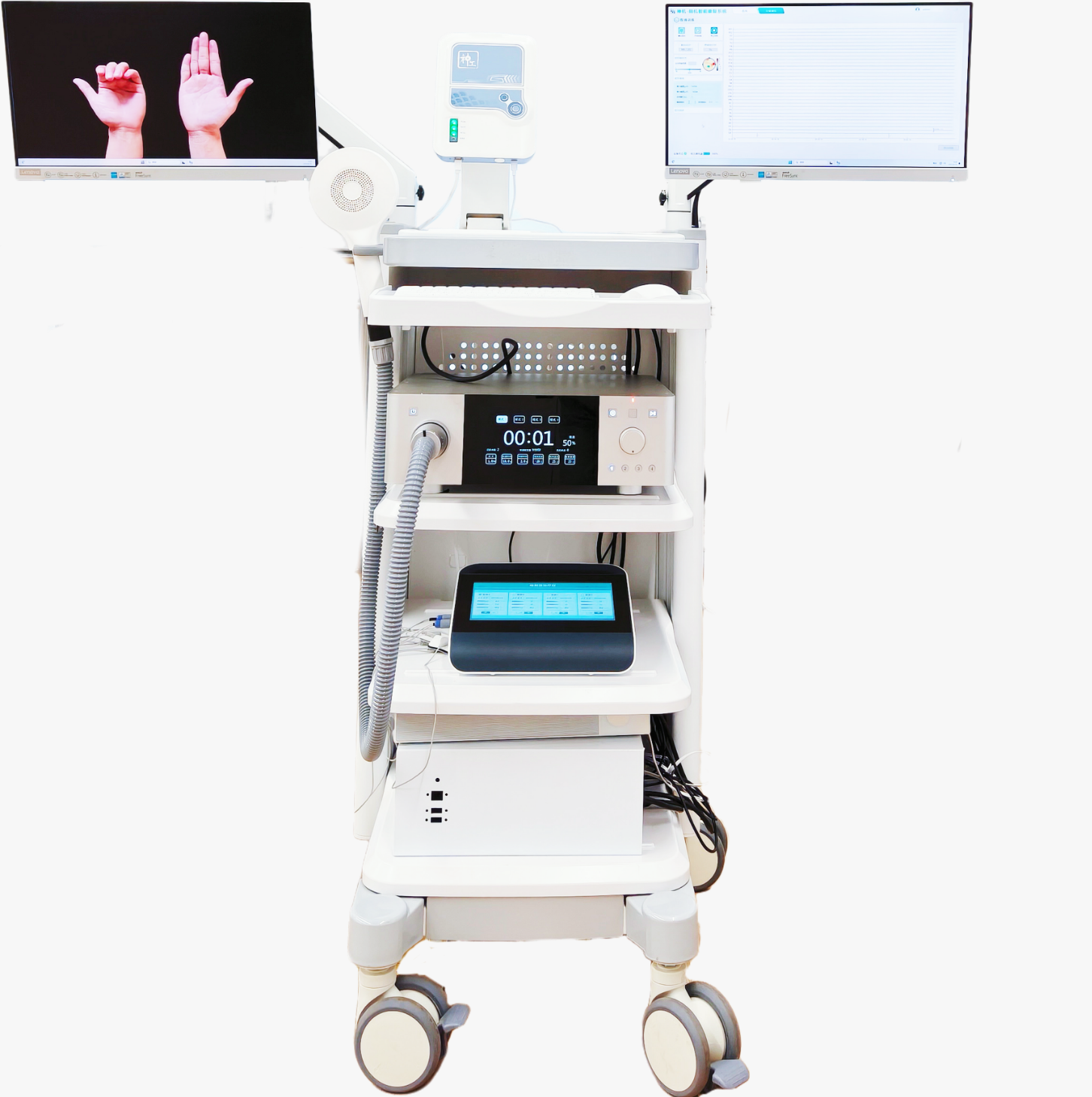 本系統(tǒng)整合了高性能腦狀態(tài)評(píng)估調(diào)控系統(tǒng)“神工-神機(jī)”和腦機(jī)接口神經(jīng)肌肉耦合驅(qū)動(dòng)下肢康復(fù)外骨骼“神工-神行”,主要應(yīng)用于腦卒中康復(fù)領(lǐng)域,“神工-神行”可實(shí)時(shí)解碼大腦運(yùn)動(dòng)意圖,實(shí)現(xiàn)患者自身意識(shí)驅(qū)動(dòng),融合自研發(fā)神經(jīng)肌肉電刺激與電機(jī)混合助行技術(shù),實(shí)現(xiàn)主動(dòng)式閉環(huán)康復(fù)訓(xùn)練, “神工-神機(jī)”融合BCI+TMS+FES技術(shù),可實(shí)時(shí)評(píng)估大腦狀態(tài)并驅(qū)動(dòng)中樞-外周雙端刺激設(shè)備,有效激活大腦及其支配的神經(jīng)群,提升康復(fù)效率。