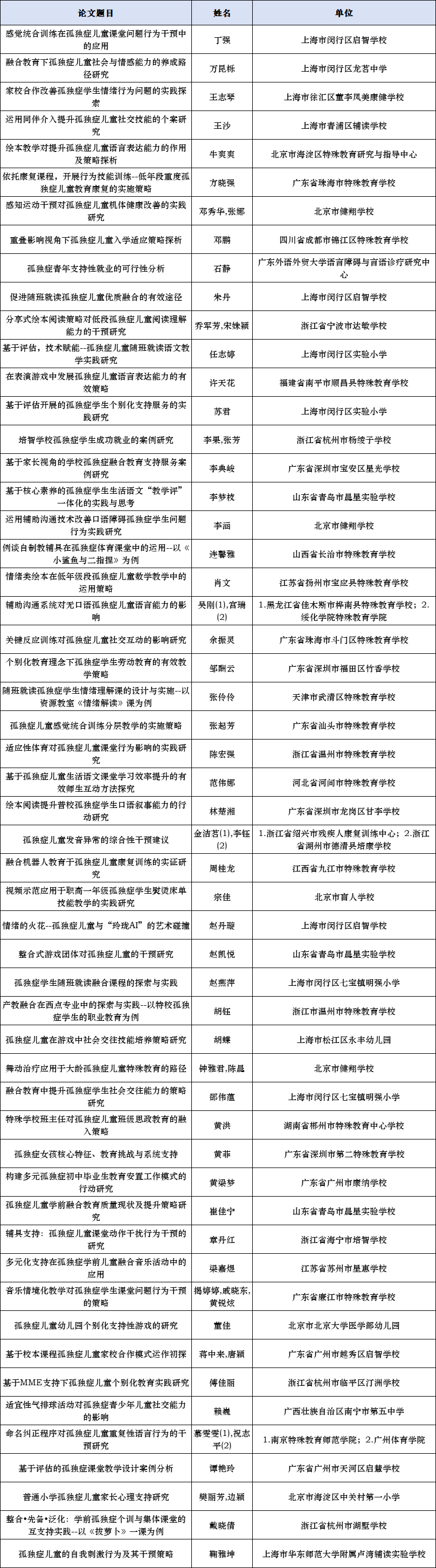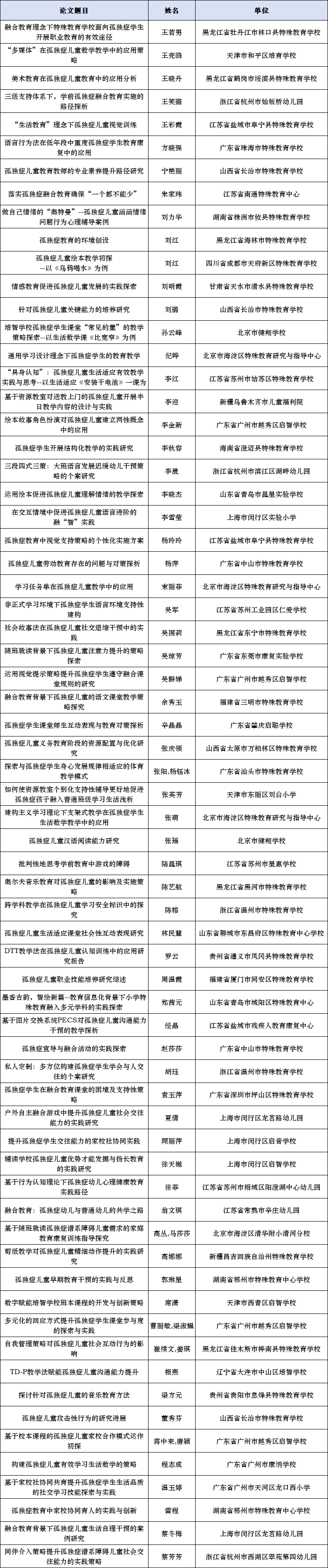 公布第一屆孤獨癥教育教學(xué)征集優(yōu)秀組織單位,優(yōu)秀、創(chuàng)新和鼓勵論文名單;公布第一屆孤獨癥教學(xué)案例優(yōu)秀組織單位,優(yōu)秀、創(chuàng)新和鼓勵課例名單