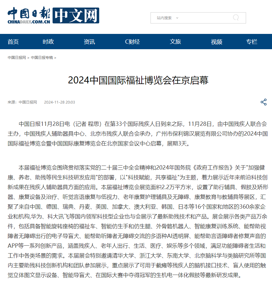 本屆福祉博覽會圍繞貫徹落實黨的二十屆三中全會精神和2024年國務(wù)院《政府工作報告》關(guān)于"加強健康、養(yǎng)老、助殘等民生科技研發(fā)應(yīng)用"的部署,以"科技賦能,共享福祉"為主題,著力展示近年來前沿科技創(chuàng)新成果在殘疾人輔助器具方面的應(yīng)用。本屆福祉博覽會展覽面積2.2萬平方米,設(shè)置了助行輔具、假肢及矯形器、康復(fù)設(shè)備及治療、聽覺言語康復(fù)與低視力、老年康復(fù)護理輔具及無障礙、康復(fù)教育與教輔具等展區(qū),匯聚了來自中國、德國、瑞典、丹麥、美國、加拿大、澳大利亞、韓國、日本等16個國家和地區(qū)的360余家企業(yè)和機構(gòu),華為、科大訊飛等國內(nèi)領(lǐng)軍科技型企業(yè)也與會展示了最新助殘技術(shù)和產(chǎn)品。展會展示各類產(chǎn)品萬余件,包括具備智能旋轉(zhuǎn)座椅的福祉車、智能仿生手和仿生腿、外骨骼機器人、智能康復(fù)訓練系統(tǒng)、能幫助視障者無障礙出行的電子導(dǎo)盲犬、能幫助聽障者無障礙交流的多語種AI透明屏、能幫助言語障礙者修復(fù)聲音的APP等一系列創(chuàng)新產(chǎn)品,涵蓋殘疾人、老年人出行、生活、醫(yī)療、娛樂等多個領(lǐng)域,滿足功能障礙者生活和工作中各類場景的需求。