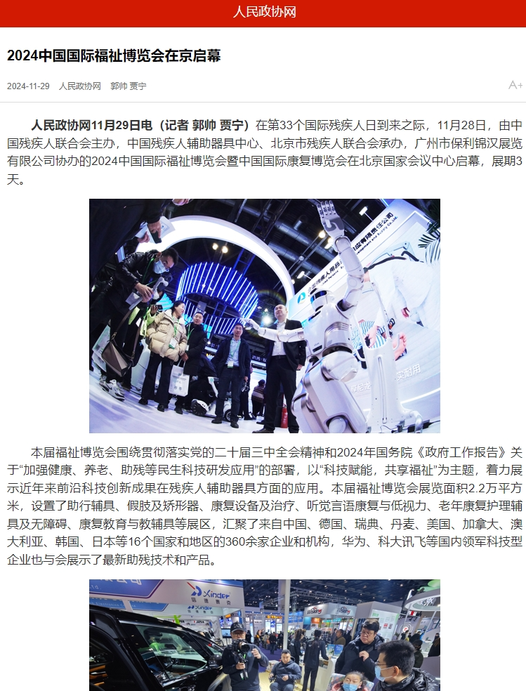 在第33個(gè)國(guó)際殘疾人日到來(lái)之際,11月28日,由中國(guó)殘疾人聯(lián)合會(huì)主辦,中國(guó)殘疾人輔助器具中心、北京市殘疾人聯(lián)合會(huì)承辦,廣州市保利錦漢展覽有限公司協(xié)辦的2024中國(guó)國(guó)際福祉博覽會(huì)暨中國(guó)國(guó)際康復(fù)博覽會(huì)在北京國(guó)家會(huì)議中心啟幕,展期3天。