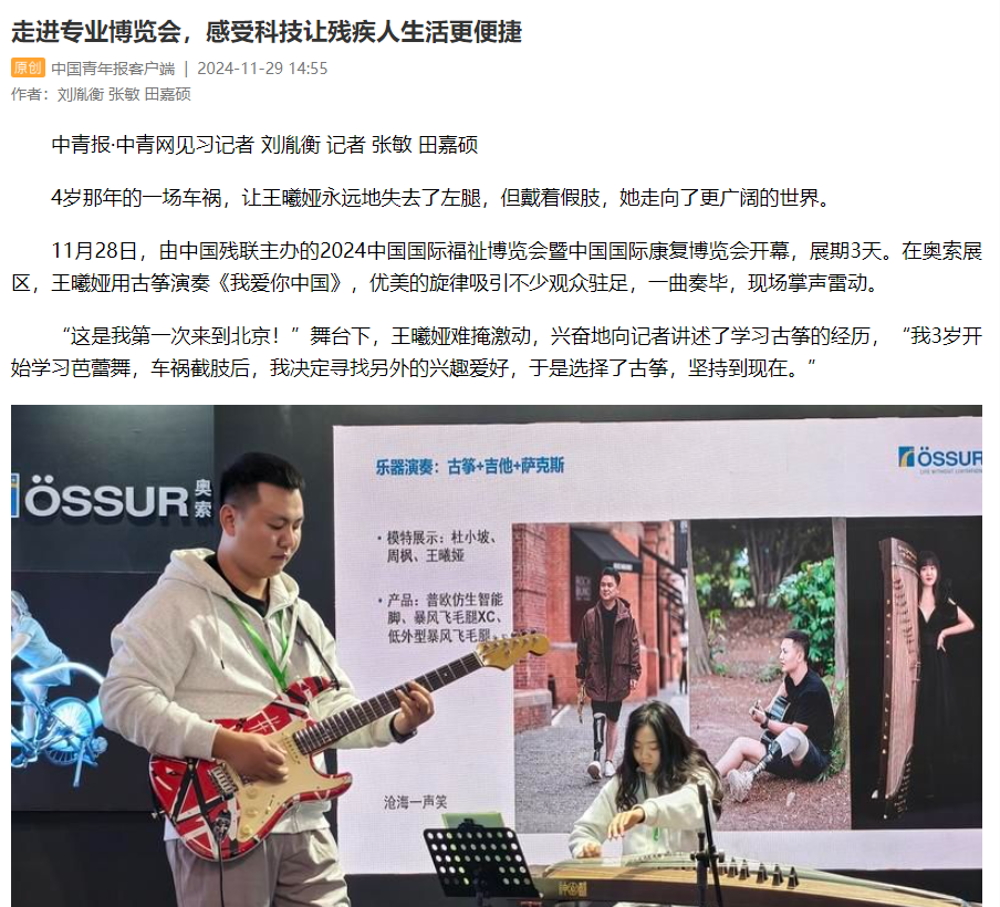 11月28日,由中國(guó)殘聯(lián)主辦的2024中國(guó)國(guó)際福祉博覽會(huì)暨中國(guó)國(guó)際康復(fù)博覽會(huì)開幕,展期3天。在奧索展區(qū),王曦婭用古箏演奏《我愛你中國(guó)》,優(yōu)美的旋律吸引不少觀眾駐足,一曲奏畢,現(xiàn)場(chǎng)掌聲雷動(dòng)。