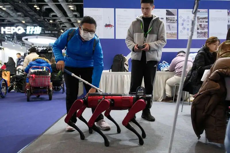 11月28日,2024中國(guó)國(guó)際福祉博覽會(huì)暨中國(guó)國(guó)際康復(fù)博覽會(huì)現(xiàn)場(chǎng),觀眾體驗(yàn)導(dǎo)盲機(jī)器人。田嘉碩/攝