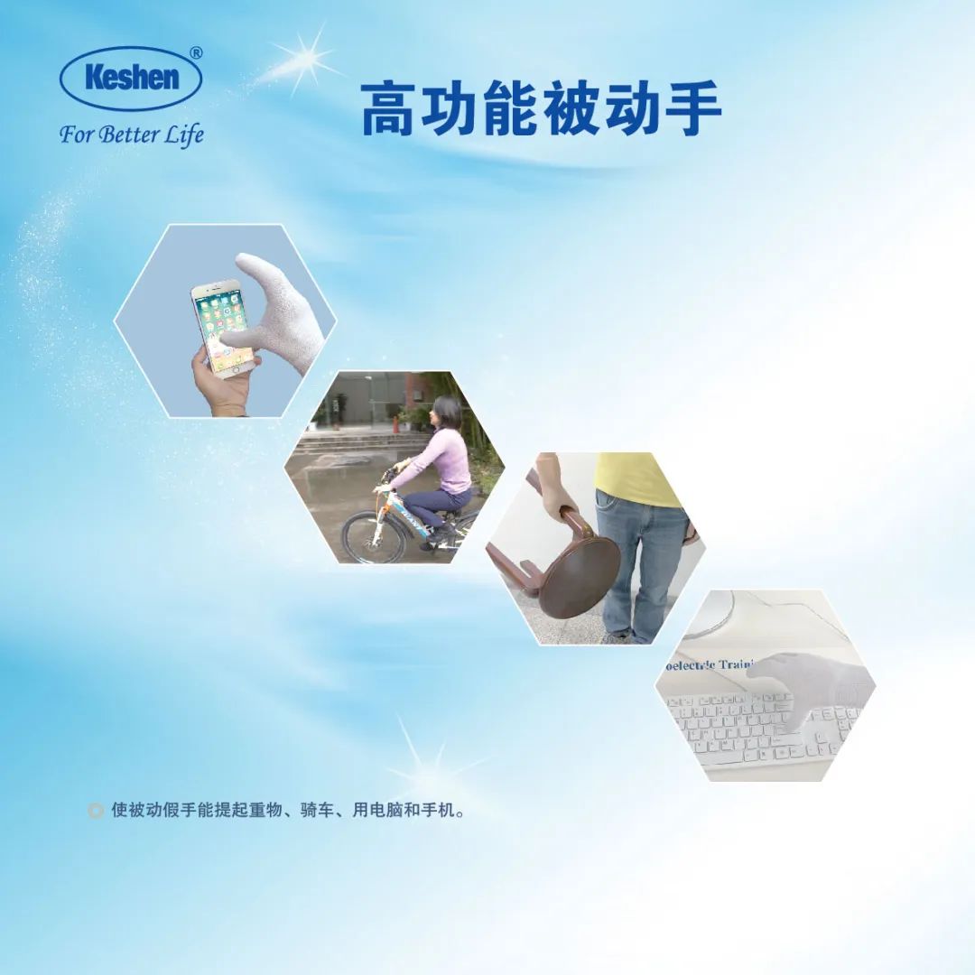 高功能被動手可使裝飾性假手具有可實用抓握功能。只需按壓腕部便可張開假手,操作簡單,輕松方便。同時在按壓腕部開閉手的同時,可在不同位置輕松鎖定假手。此外,該產品手型可變,可在手指放松的裝飾性假手形態(tài),和對指抓握狀態(tài)之間,方便地任意轉變。同時,手指可在不同位置鎖定,使裝飾性假手能提物、騎車、用電腦和手機、持筆寫字。不僅如此,該產品重量輕,不需電池便可下水,使用簡單方便。
