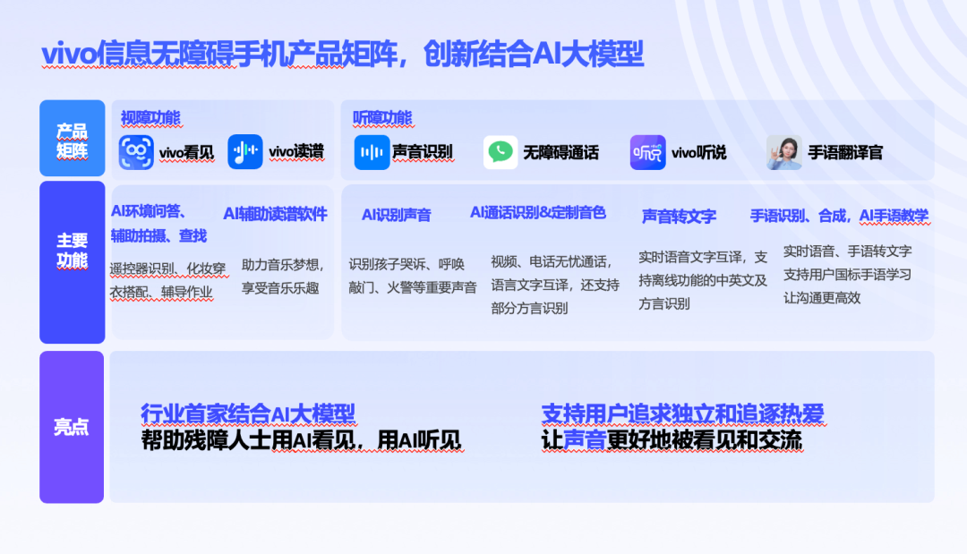 vivo 始終踐行“科技照亮美好未來”的使命,在無障礙領域已構建起系統(tǒng)性解決方案。聽覺上,“vivo 聽說”實時實現(xiàn)語音文字互轉,讓聽障朋友接打電話、面對面交流都順暢;“聲音識別” 敏銳捕捉嬰兒啼哭、汽車喇叭等關鍵音;全球首款“手語翻譯官”更填補空白,識別1300個手語詞匯,準確率超 80%,讓無聲表達被讀懂。視覺上,“vivo 看見”是行業(yè)首個依托自研多模態(tài)大模型,幫視障朋友描述環(huán)境、讀保質期、獨立逛書店陪孩子等;“vivo 讀譜”讓盲人免費學鋼琴,不用再依賴厚重盲譜。從單一功能到生態(tài)共建,從技術創(chuàng)新到公益落地,vivo 的無障礙之路始終圍繞“有愛,無礙”的初心。