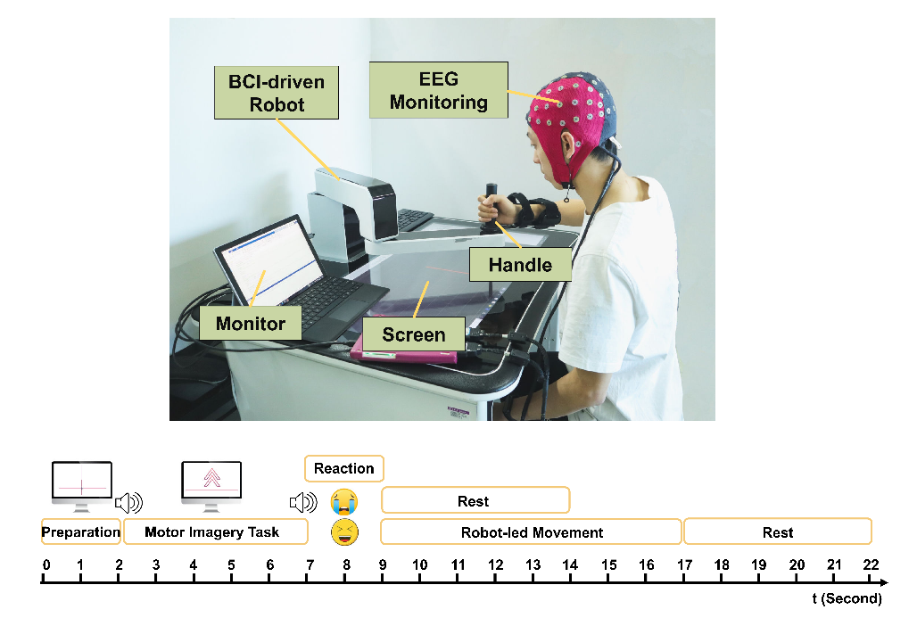本項腦機交互技術(shù)實時解碼人體的運動意圖進而實現(xiàn)控制外部設(shè)備執(zhí)行相應(yīng)的動作。在康復(fù)訓(xùn)練過程中,患者可通過調(diào)動自身的主動運動意圖控制康復(fù)機器人牽動偏癱側(cè)肢體執(zhí)行相應(yīng)的動作,肢體運動反饋至大腦形成感覺,進而影響下一次控制指令的發(fā)出,同時,運動感覺反饋可有效的刺激大腦皮質(zhì),在神經(jīng)重塑和功能重建中發(fā)揮著重要的作用。腦機交互康復(fù)訓(xùn)練將神經(jīng)活動和肢體的行為動作建立了聯(lián)系,促進患者正向的運動知覺的形成。同時,該方法也在心理層面幫助患者重新建立信心,提高其參與康復(fù)訓(xùn)練的意愿和投入程度。