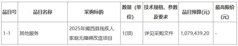 采購需求:采購包1(2025年揭西縣殘疾人家庭無障礙改造項目)