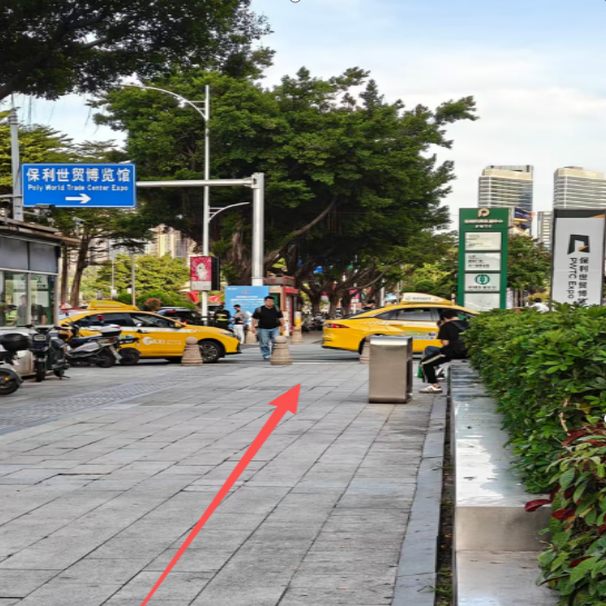 (2)按照箭頭所指方向前行,轉(zhuǎn)右,約前行100米即可抵達【保利世貿(mào)博覽館E4門】。