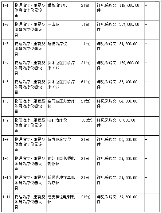 動態(tài)心電儀1臺、排痰機(jī)1臺、霧化器1臺、電動多功能床3張、糖尿病治療儀1臺、微循環(huán)修復(fù)系統(tǒng)1套、熏蒸儀1臺、輪椅3把、幽門螺旋桿菌測定儀1臺(含設(shè)備運(yùn)輸、安裝、調(diào)試及售后具體參數(shù)詳見招標(biāo)文件)。