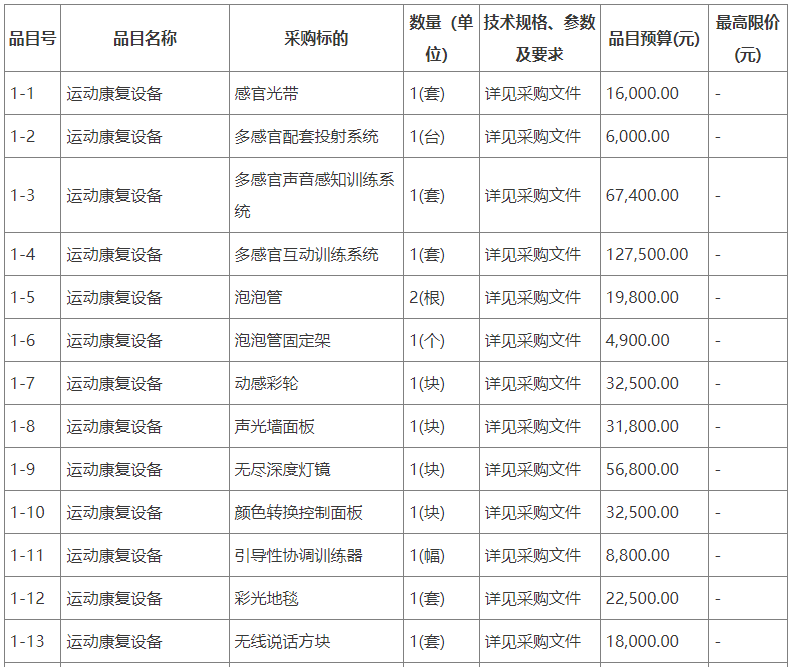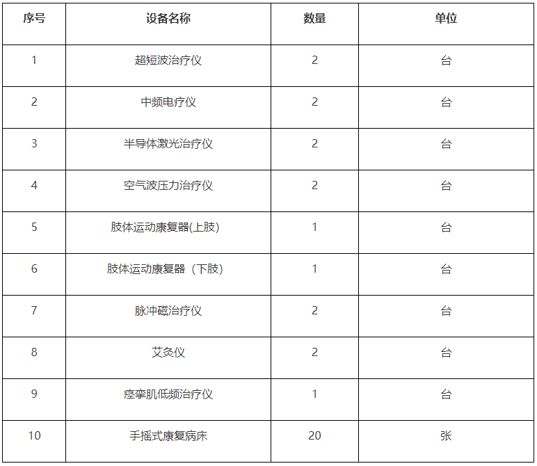 采購需求:運動康復(fù)、作業(yè)治療、言語吞咽治療、物理因子治療、傳統(tǒng)康復(fù)、疼痛科、產(chǎn)后康復(fù)等設(shè)備的采購安裝調(diào)試及相關(guān)伴隨服務(wù)。