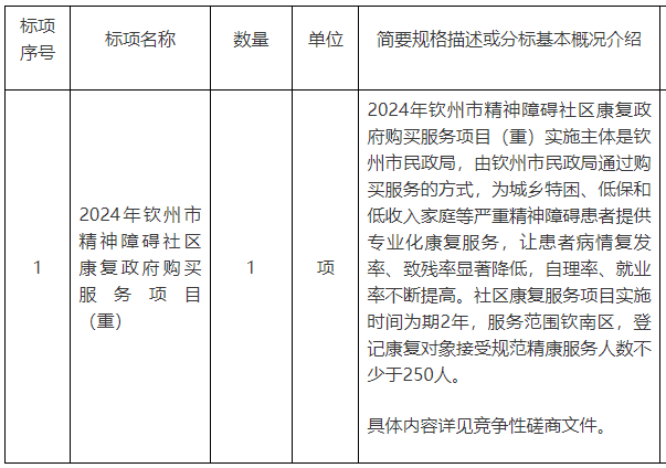 廣西榮勝項目管理有限公司關(guān)于2024年欽州市精神障礙社區(qū)康復(fù)政府購買服務(wù)項目(重)(QZZC2024-C3-990301-RSZB)競爭性磋商公告