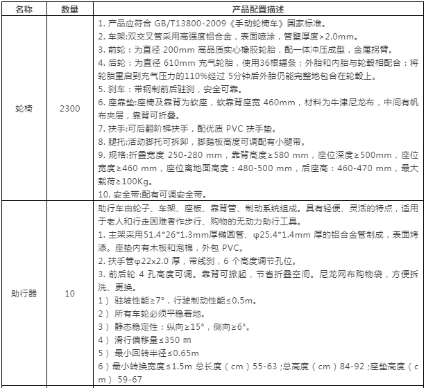 采購產(chǎn)品及數(shù)量:輪椅2300輛;助行器10個;電動助行器2個;多功能護(hù)理床1張。