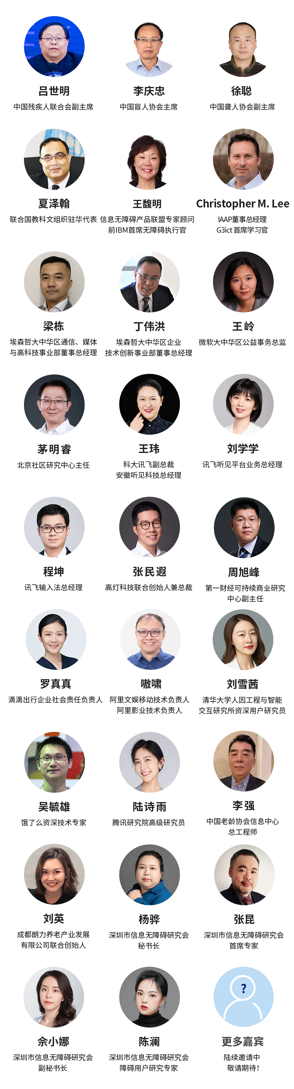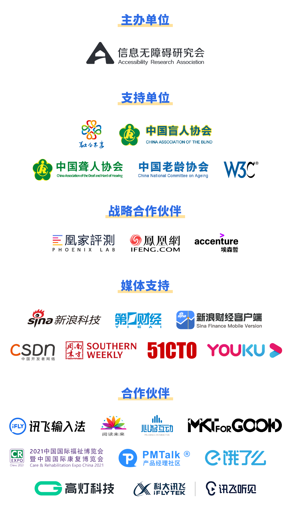 (主辦單位:信息無障礙研究會;支持單位:全國無障礙環(huán)境建設(shè)智庫;中國盲人協(xié)會;中國聾人協(xié)會;中國老齡協(xié)會;萬維網(wǎng)聯(lián)盟(W3C中國);戰(zhàn)略合作伙伴:凰家評測;鳳凰網(wǎng)科技;埃森哲;媒體支持單位:新浪科技;第一財(cái)經(jīng);新浪財(cái)經(jīng);CSDN;南方周末;51CTO;優(yōu)酷;合作伙伴:訊飛輸入法;心智互動;杭圖事業(yè)基金會閱讀未來專項(xiàng)基金;MARKETING FOR GOOD;2021中國國際福祉博覽會暨中國國際康復(fù)博覽會;PMTalk產(chǎn)品經(jīng)理社區(qū);餓了么;高燈科技;科大訊飛丨訊飛聽見)