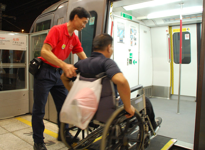 地鐵的工作人員幫助殘疾人上、下車