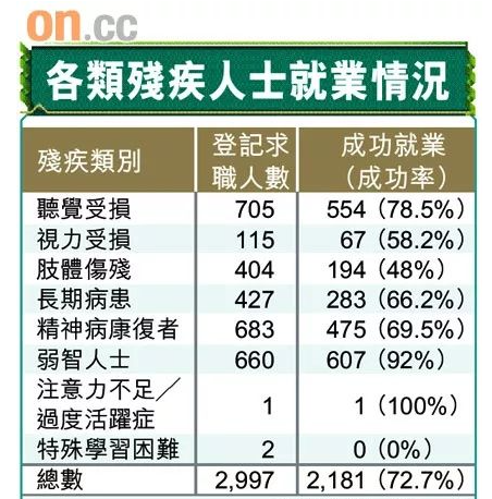 根據(jù)香港政府統(tǒng)計(jì)處12月17日公布的“殘疾人士及長期病患者統(tǒng)計(jì)調(diào)查”,現(xiàn)約有96900 人(19.7%)加入了就業(yè)市場(chǎng)。就業(yè)的殘疾人士,每月就業(yè)收入中位數(shù)為$14,000。
