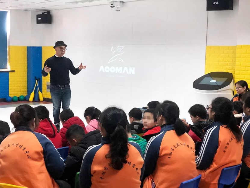 (奧漫優(yōu)悅智能多媒體教育基地落成,李峘與李羿丹與孩子們互動)