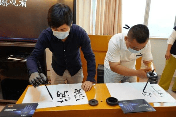 活動現(xiàn)場,幾位殘疾人朋友佩戴BrainCo強腦科技智能仿生手,手握毛筆寫下“愛滿廈門”、“手望相助”等字