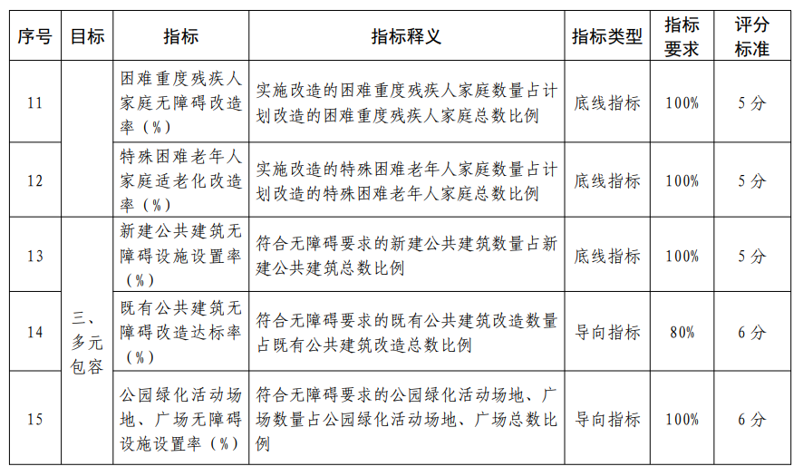 ?。ㄒ唬φ铡秳?chuàng)建全國無障礙建設(shè)示范城市(縣)考評標準》,提出創(chuàng)建目標、制定創(chuàng)建工作方案,編制無障礙環(huán)境建設(shè)發(fā)展規(guī)劃,制定無障礙設(shè)施建設(shè)和改造計劃,在創(chuàng)建周期內(nèi)能夠達到相應(yīng)要求;