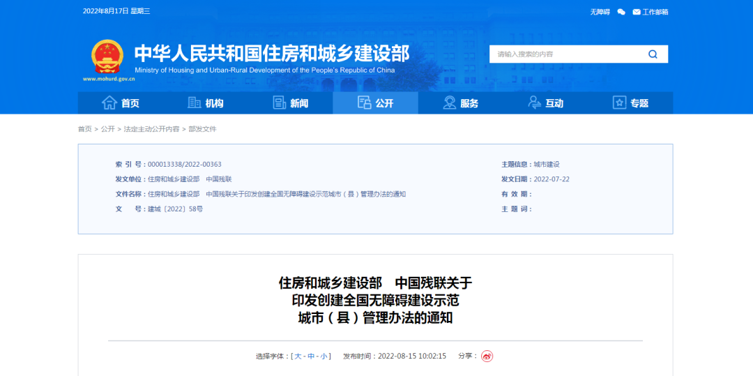 創(chuàng)建全國無障礙建設(shè)示范城市(縣)建議名單在住房和城鄉(xiāng)建設(shè)部門戶網(wǎng)站公示,公示期為10個工作日。公示無異議的,由住房和城鄉(xiāng)建設(shè)部、中國殘聯(lián)正式命名。