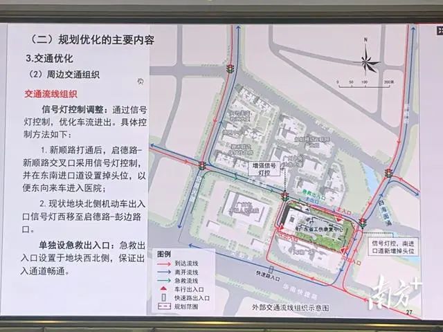 在空間效果方面,一、二期工程建筑通過連廊聯(lián)系,打造一體化、便捷化的康復(fù)建筑群。優(yōu)化提升的規(guī)劃提出,要控制二期工程建筑高度,舒緩其對廣州市中級人民法院的壓迫,沿啟德路界面空間形態(tài)和諧、視覺感覺舒緩。