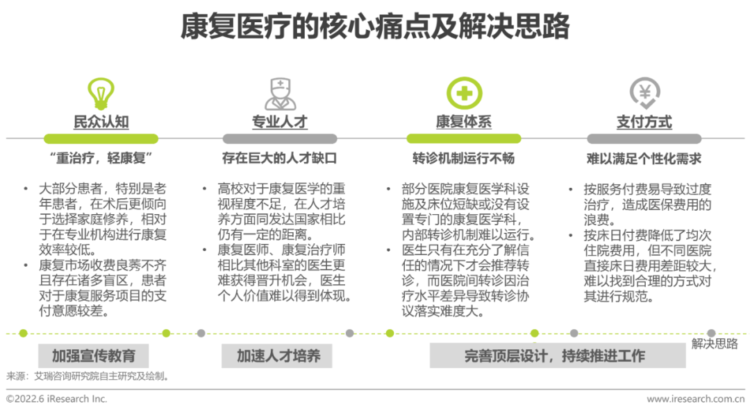 康復(fù)醫(yī)療的發(fā)展很大程度上需要支付端的不斷推動,目前我國人均康復(fù)花費較低,對于市場的進(jìn)一步擴(kuò)容造成了阻礙。艾瑞認(rèn)為,目前我國康復(fù)醫(yī)療支付端的痛點問題主要集中在兩方面,首先,患者對于整體康復(fù)醫(yī)療的意識與認(rèn)知仍存在偏差,在康復(fù)方面投入資金的意愿不強(qiáng);其次,我國的醫(yī)保體系所覆蓋的康復(fù)類項目少且并沒有隨著醫(yī)療技術(shù)的發(fā)展而調(diào)整項目類型和項目價格,不符合目前的社會價值,整體體系有待完善,同時商保覆蓋率極低,目前只有少數(shù)高端商保有所涉及。