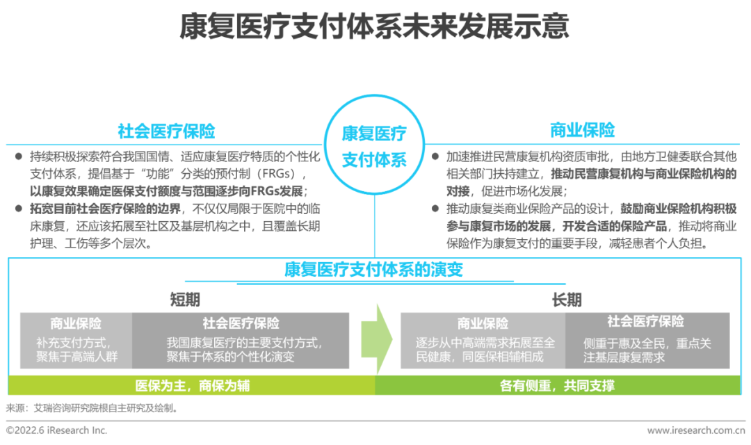 隨著我國康復(fù)醫(yī)療整體市場的擴(kuò)增及高速發(fā)展,康復(fù)醫(yī)療支付體系也會愈加完善。其中,社會醫(yī)療保險支付將按照醫(yī)療的價值付費,“遏制無效醫(yī)療,支持有效醫(yī)療”,逐漸走向基于“功能”分類的預(yù)付制(FRGs) ,商業(yè)保險則會在相關(guān)部門的助推及市場刺激之下逐步納入我國康復(fù)醫(yī)療支付體系。短期內(nèi),二者將保持以“醫(yī)保為主,商保為輔”的模式,分別適用于基層群眾以及高端人群,而后隨著商保近年來致力于打造大健康支付、健康閉環(huán),商業(yè)保險機(jī)構(gòu)將從服務(wù)用戶全生命周期視角出發(fā),關(guān)注康復(fù)醫(yī)療項目,逐漸形成醫(yī)保、商保雖各有側(cè)重,但相輔相成的康復(fù)醫(yī)療支付體系。
