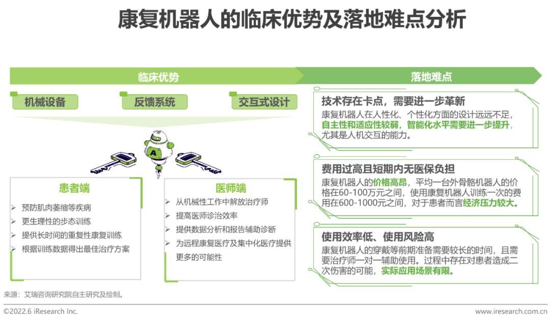 康復(fù)機(jī)器人是近年來備受市場關(guān)注的高端康復(fù)醫(yī)療器械,屬于機(jī)器人技術(shù)與醫(yī)療技術(shù)結(jié)合的產(chǎn)物,被認(rèn)為是特殊環(huán)境下的“可穿戴設(shè)備”,具備助殘行走、康復(fù)治療、減輕勞動強(qiáng)度等功能,能夠幫助殘疾患者重新恢復(fù)運(yùn)動能力,帶來回歸社會的希望,也能夠進(jìn)一步減輕康復(fù)醫(yī)師的工作負(fù)擔(dān)。但作為一個新興賽道,康復(fù)機(jī)器人的發(fā)展同時也面臨著諸多落地性商業(yè)化難點,目前的技術(shù)尚難以支撐康復(fù)機(jī)器人的理想化運(yùn)作,其使用效率較低且風(fēng)險高,同時康復(fù)機(jī)器人的使用費用高昂且短期內(nèi)無法納入醫(yī)保支付體系,對于患者而言,整體性價比較低。