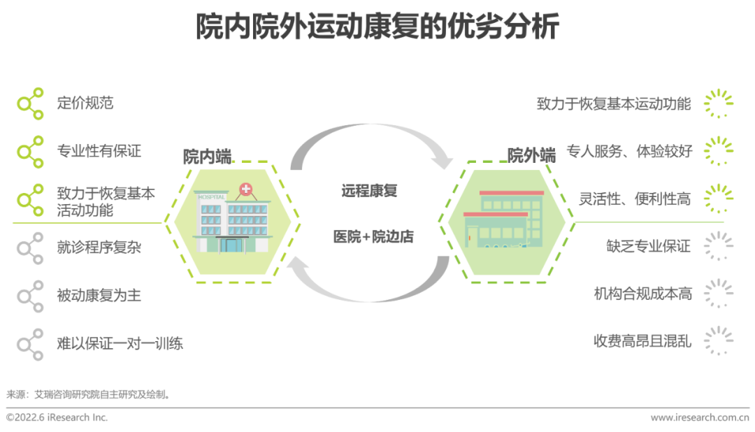 目前運(yùn)動康復(fù)行業(yè)中存在院內(nèi)院外兩方分工不明、定位不準(zhǔn)的問題,問題的產(chǎn)生主要來自兩個方面。一方面,患者對于疾病的恢復(fù)過程認(rèn)知薄弱,難以選擇適合自身實際情況的康復(fù)方式及場景;另一方面,院內(nèi)院外兩方缺乏有效鏈接,沒有形成一體化的服務(wù)體系。為了解決目前的困境,院外機(jī)構(gòu)可以考慮選址在專業(yè)技術(shù)較強(qiáng)的醫(yī)院附近,這樣不僅能夠減少獲客成本,而且也有利于承上啟下,加快三級康復(fù)醫(yī)療體系的建設(shè)與流通。同時,建立遠(yuǎn)程康復(fù)平臺可以加強(qiáng)患者同醫(yī)生之間的交流,醫(yī)生能夠遠(yuǎn)程指導(dǎo)患者進(jìn)行基礎(chǔ)的康復(fù)訓(xùn)練,為患者節(jié)省更多的時間及金錢成本。