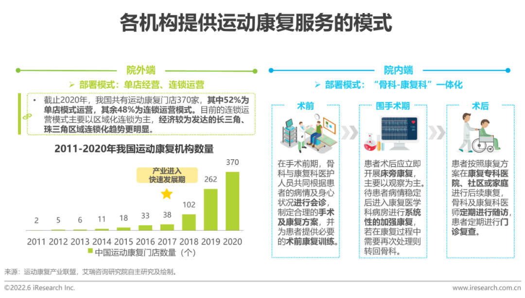 隨著人們健康意識的提升,全民健身運(yùn)動已成為一種新潮流,但隨之而來的是人們在體育鍛煉中而引發(fā)的各種運(yùn)動損傷。根據(jù)《中國衛(wèi)生健康統(tǒng)計年鑒》顯示,2021年中國因骨科疾病住院接受手術(shù)治療的患者超過400萬。同時,白領(lǐng)人群由于久坐少動而產(chǎn)生的一系列“職業(yè)病”也層出不窮,運(yùn)動康復(fù)能夠為這兩類人群提供更好的愈后幫助。目前,我國運(yùn)動康復(fù)服務(wù)主要由院內(nèi)、院外兩端提供,院外各機(jī)構(gòu)采取單店經(jīng)營模式,運(yùn)營能力較強(qiáng)的機(jī)構(gòu)會逐步在區(qū)域內(nèi)開展連鎖化;院內(nèi)主要由骨科和康復(fù)科共同構(gòu)建一體化康復(fù)模式。